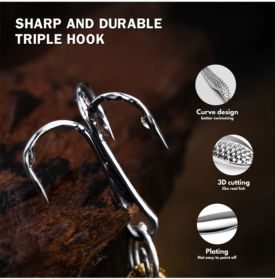 3. Rico en carbono gancho de acero: todos estos Señuelos de Pesca vienen con un gancho afilado de acero al carbono, afilado, resistente al desgaste y no es fácil de doblar. El diseño de triple gancho facilita la sujeción firme del pez, haciendo que sea menos difícil que el pez se rompa.