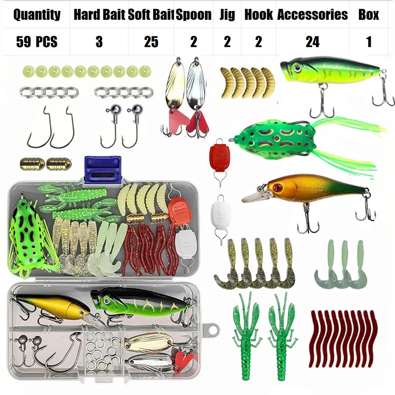 Este juego de Señuelos de Pesca viene con 18/21/59/piezas de señuelos mixtos, proporcionando una amplia gama de opciones para diferentes situaciones de pesca.