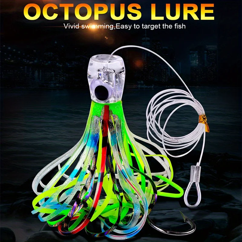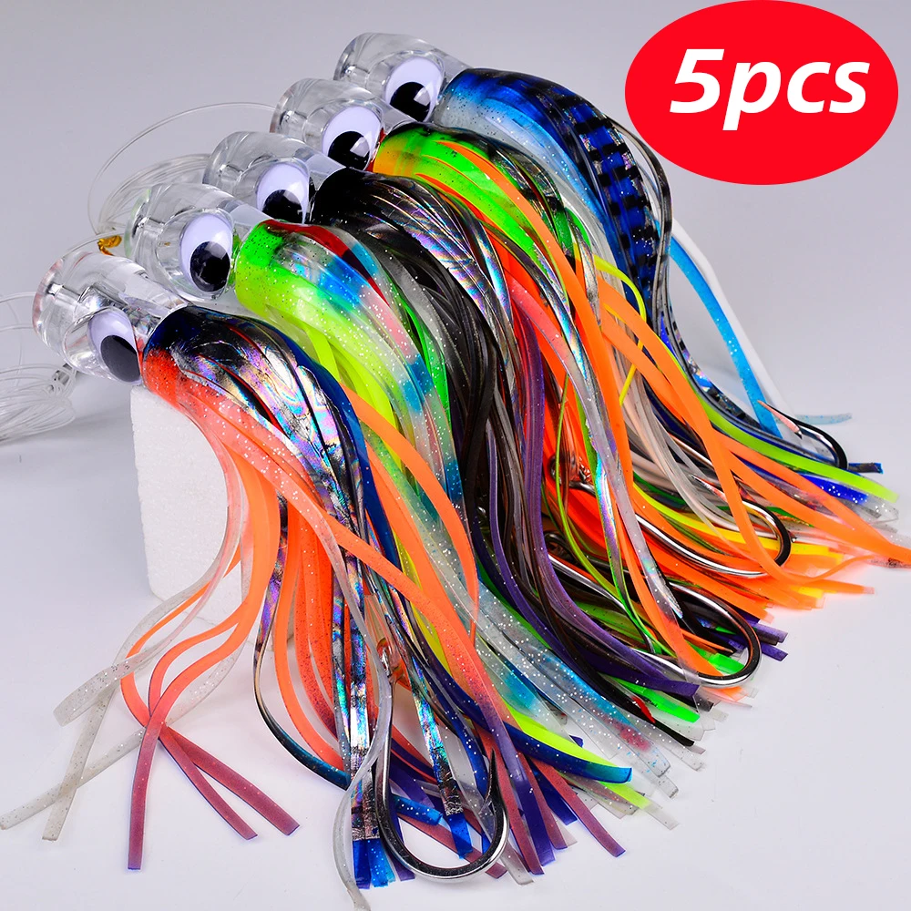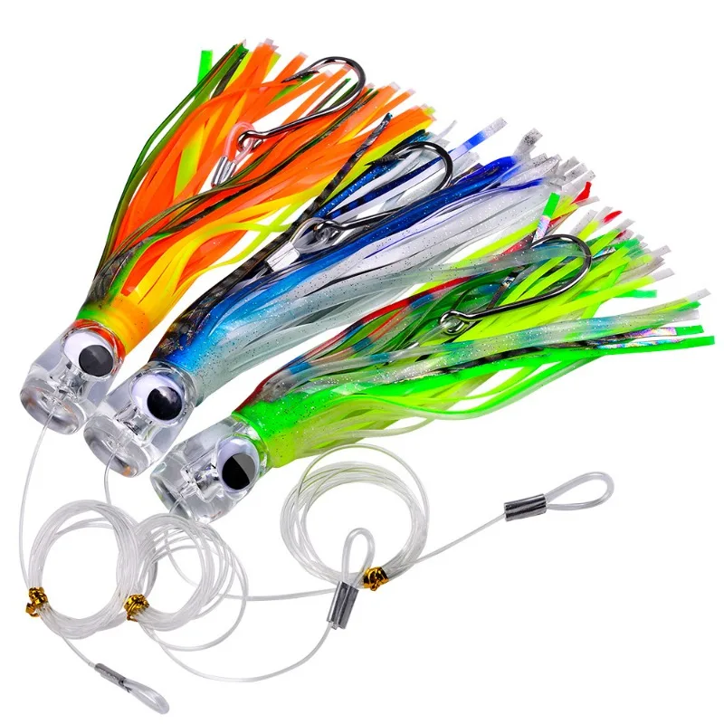 Cantidad: 5 piezas Peso: 70G, 96G Longitud: 6 pulgadas, 9 pulgadas Material: señuelo de goma para faldas, anzuelos de pesca de acero inoxidable, hilo de nailon. Modelo: aparejo líder de pesca en agua salada de gran juego Tamaño del gancho de acero inoxidable: 6/0, 8/0 Característica: 1.Cabeza de plantilla de cristal con grandes ojos 3D, cebo de faldas de silicona multibrillante, vívido en el agua. 2.Anzuelo de pesca con púas de acero inoxidable, afilado y resistente a la corrosión en agua salada. 3. Peces objetivo: Marlin, pez vela, atún, caballa, pez rey, barracuda, mahi, tiburón, Wahoo, etc. peces de caza grandes.