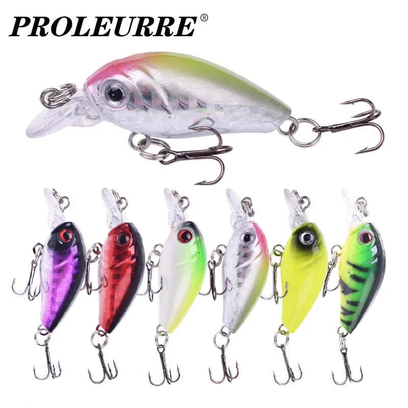Brand: ProleurreLure Type: Crank Fishing LureLength: 4.5cmWeight: 4gSwim Depth: TopwaterColor: 6 ColorsMaterial: ABS PlasticHook Type: High Carbon Treble HooksEyes: 3D EyesPacking list:6pcs/Lot Mixed colors