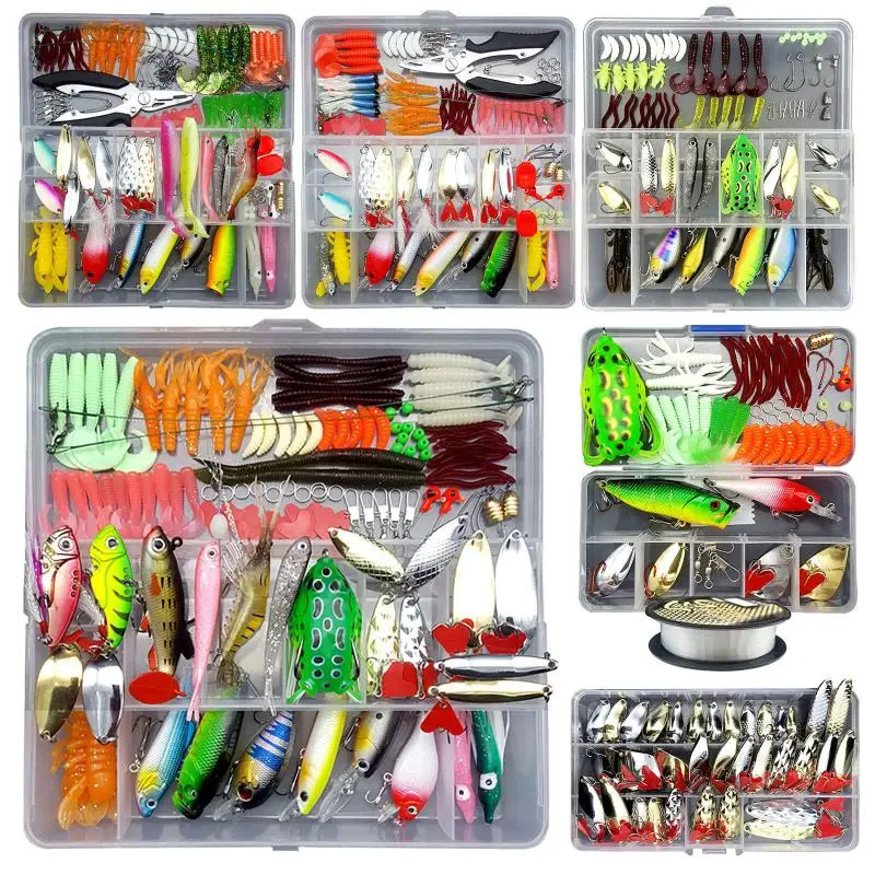 -Juego de señuelos: el juego de señuelos con caja de aparejos contiene casi todos los accesorios, incluidos cebos blandos, pececillos, ranas trueno, lentejuelas. Desde cebos normales hasta accesorios para una variedad de accesorios de pesca, este juego de cebos puede ser el paquete completo de cualquier pescador para cualquier temporada en cualquier agua.