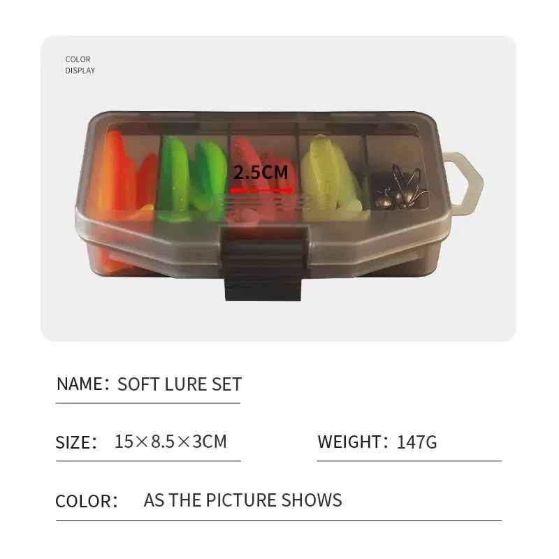 • Caja de señuelos compacta:El juego viene con una caja de señuelos compacta, lo que facilita el almacenamiento y transporte de sus señuelos durante sus viajes de pesca.