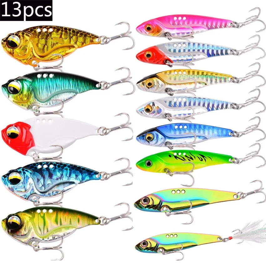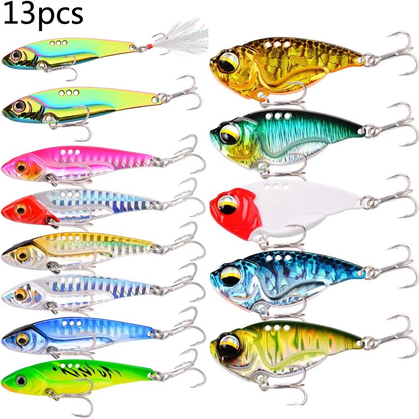 Juego de Señuelos de Pesca de hoja Vib de Metal mezclado con ojos 3D, 13 piezas, vibración de hundimiento, Spinner, cuchara, cebos, Vibe Artificial para perca, Lucio