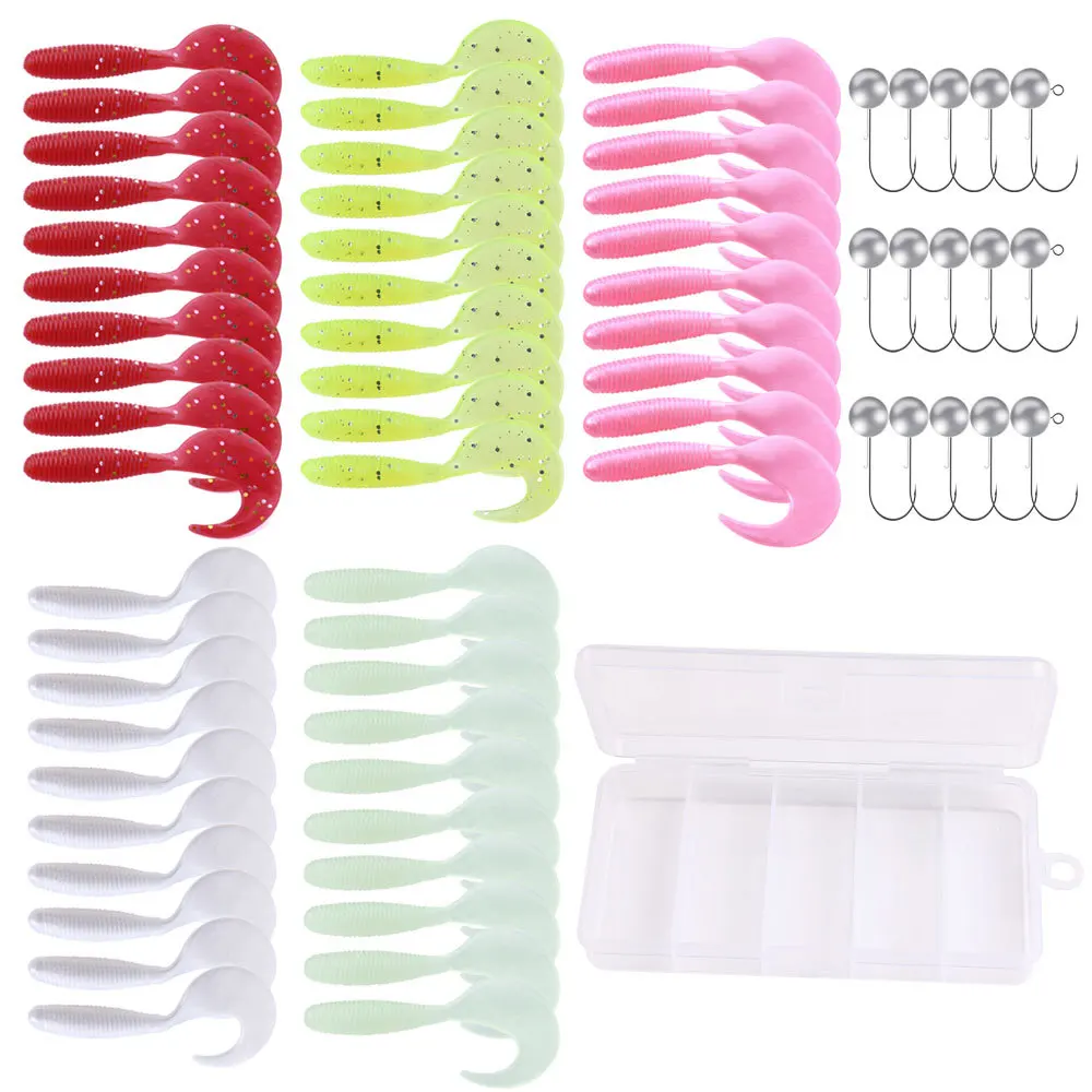 Kit de señuelos de pesca blandos, 45 Uds./34 Uds./60 Uds./65 Uds., juego de señuelos de silicona, gusano de cebo Artificial con manivela, anzuelo de cabeza, pececillo de lubina