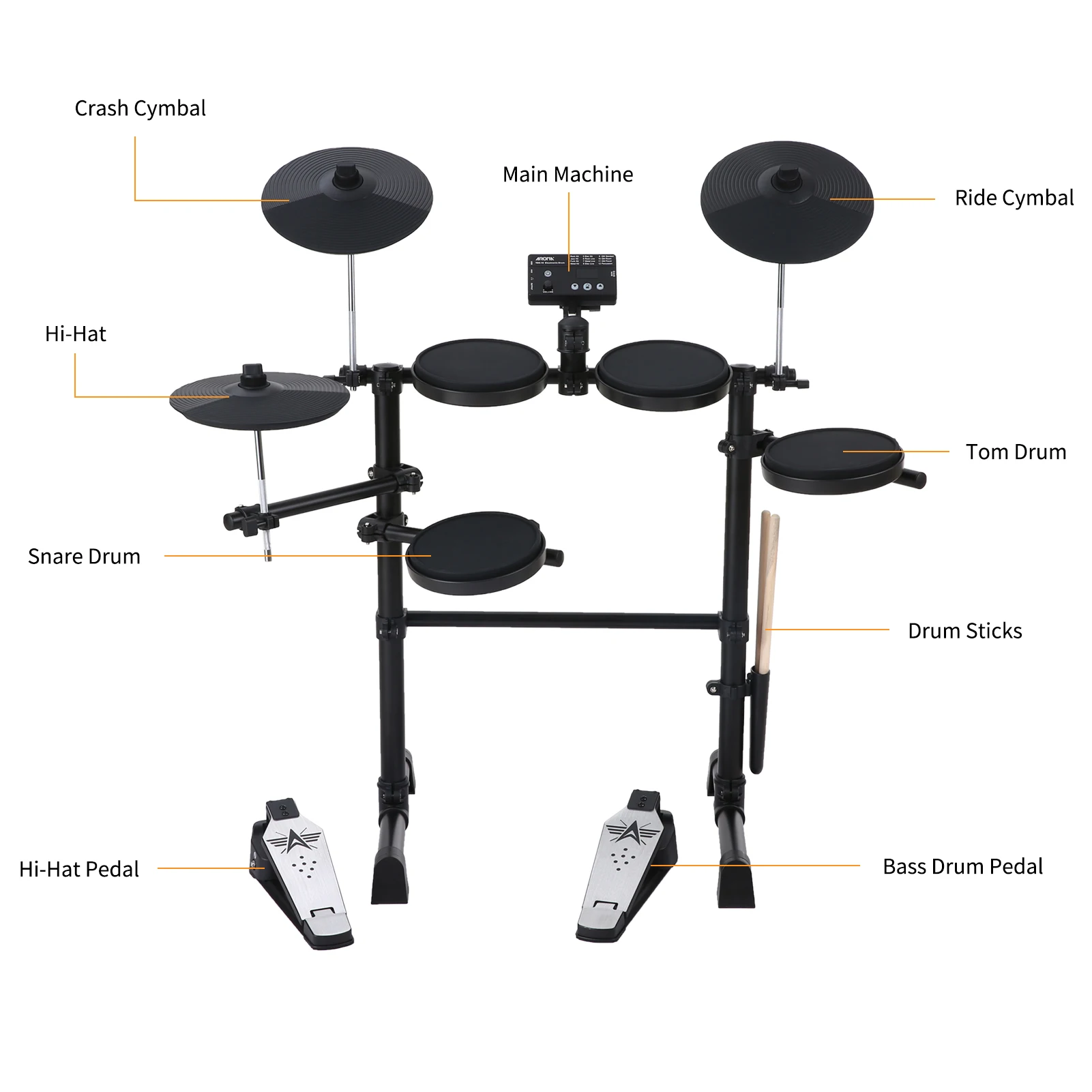 Características:【Calidad Premium】Hemos adoptado un platillo de silicona de alta gama en negro elegante, que tiene una respuesta de tono estable y bien distribuida en cualquier posición del platillo. El soporte de metal de hierro plegable es más estable y seguro.