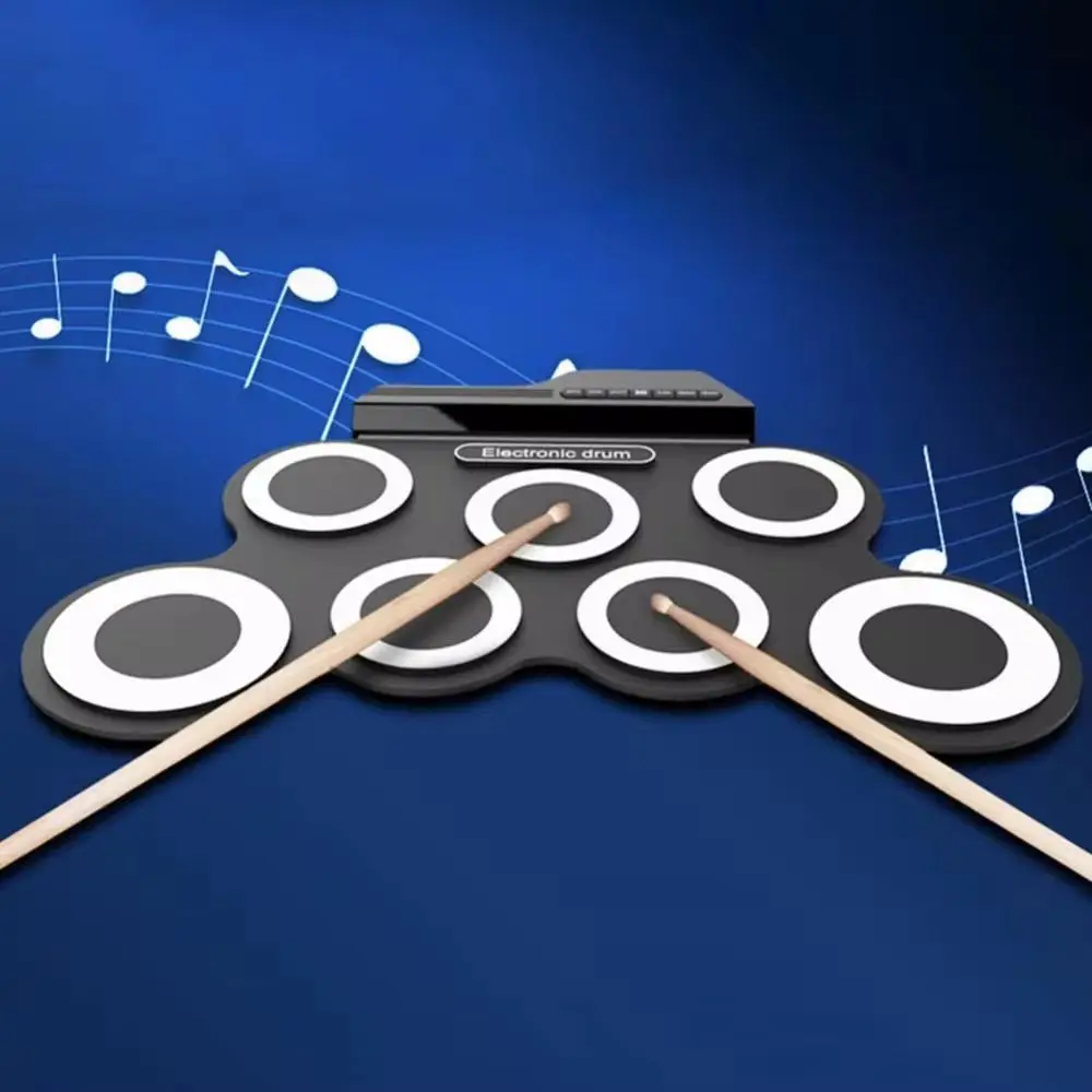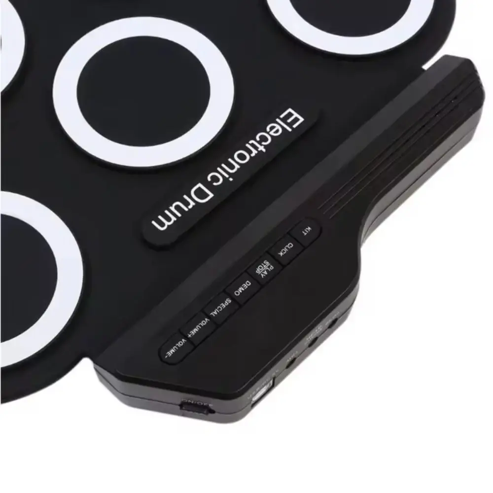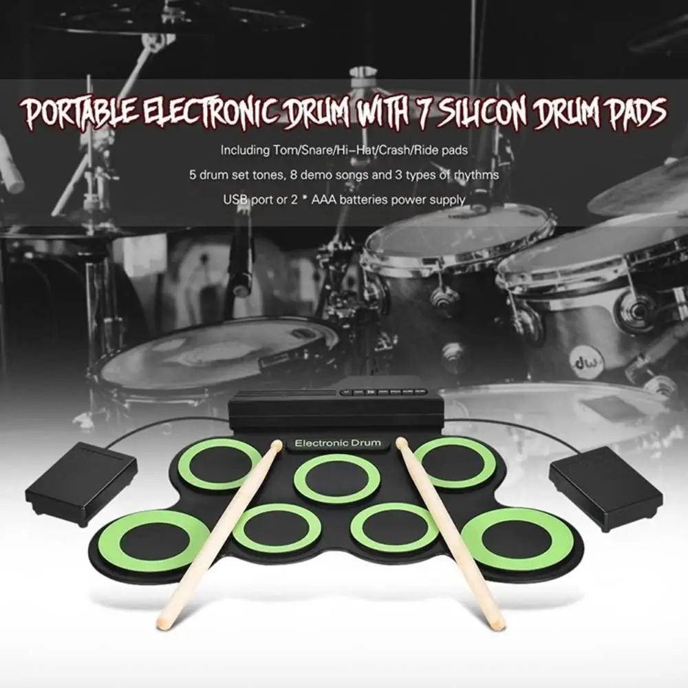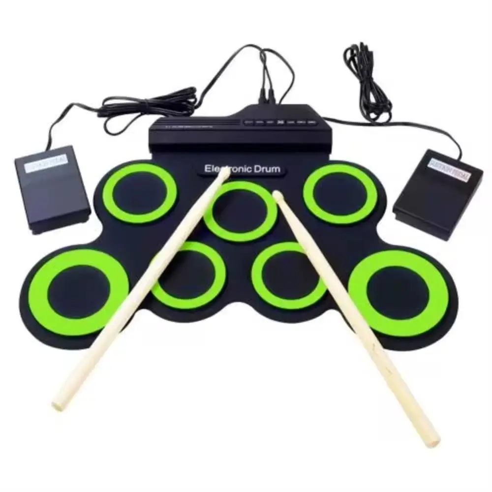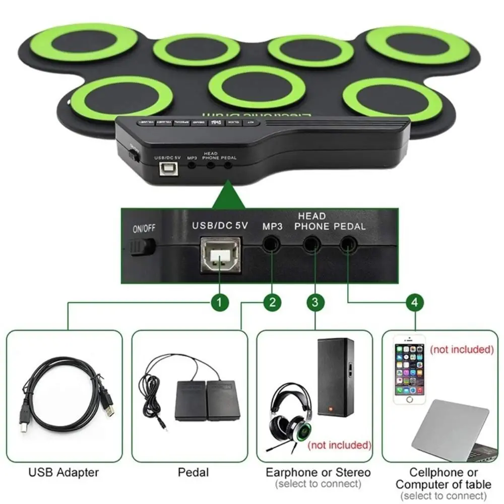 Color: Blanco y Negro/Negro y Verde Material: Silicona + Plástico Tonos de batería: POP, Rock, Latin, Electro, Percusión Demostración Canciones: Heavy Rock, Funk, Latin, Dance, samba, Cha-Cha, Swing Hi-Hat, Rock Fuente de alimentación: Cable USB (incluido) o 2 pilas AAA (no incluidas) Tamaño de la Caja: 43*15*6,85 cm (16,93*5,91*2.70in) Lista del paquete: 1 * Batería Electrónica, 2 * baquetas, juego de pedal 1 *, 1 * Cable USB (1,2 m),1 * Cable de audio de 3,5mm (0,5 m),1 * Manual de usuario 1. Simula los tambores con pedales, practica con las manos y los pies más como si fueran tambores reales, las manos y los pies se coordinan bien. 2. de doble canal Salida, buen efecto de sonido (debe estar conectado a altavoces externos para hacer sonido). 3. Salida de auriculares, puede practicar sin molestar a los demás. 4. La función básica del metrónomo incorporado es entrenar un buen sentido del ritmo. 5. Con conector de salida de auriculares de 3,5mm para conectar auriculares o altavoces externos. 6. Con entrada MP3 para conectar MP3/teléfono inteligente/tableta para reproducir música de respaldo.