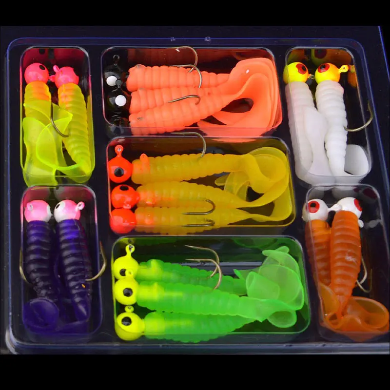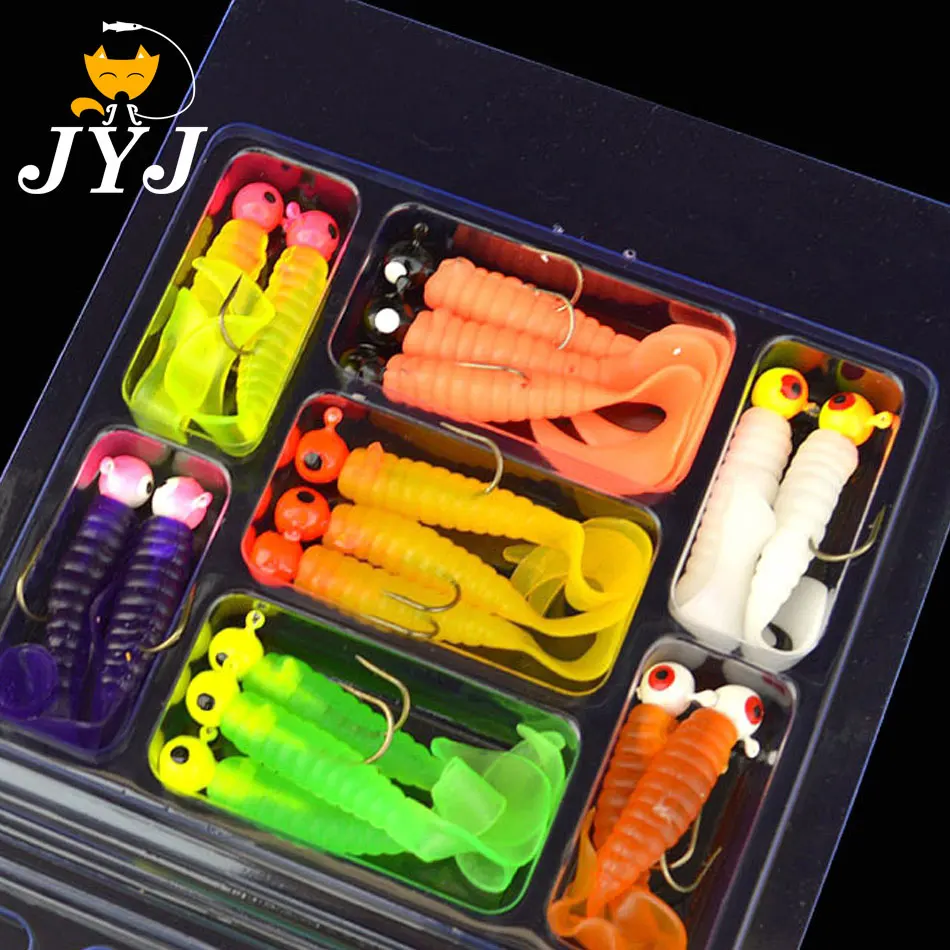 JYJ 34 Uds 1 Juego de anzuelos de pesca con cabeza de plantilla de Metal señuelo de gusano suave Grub aparejos de cebo Artificial de pez de silicona