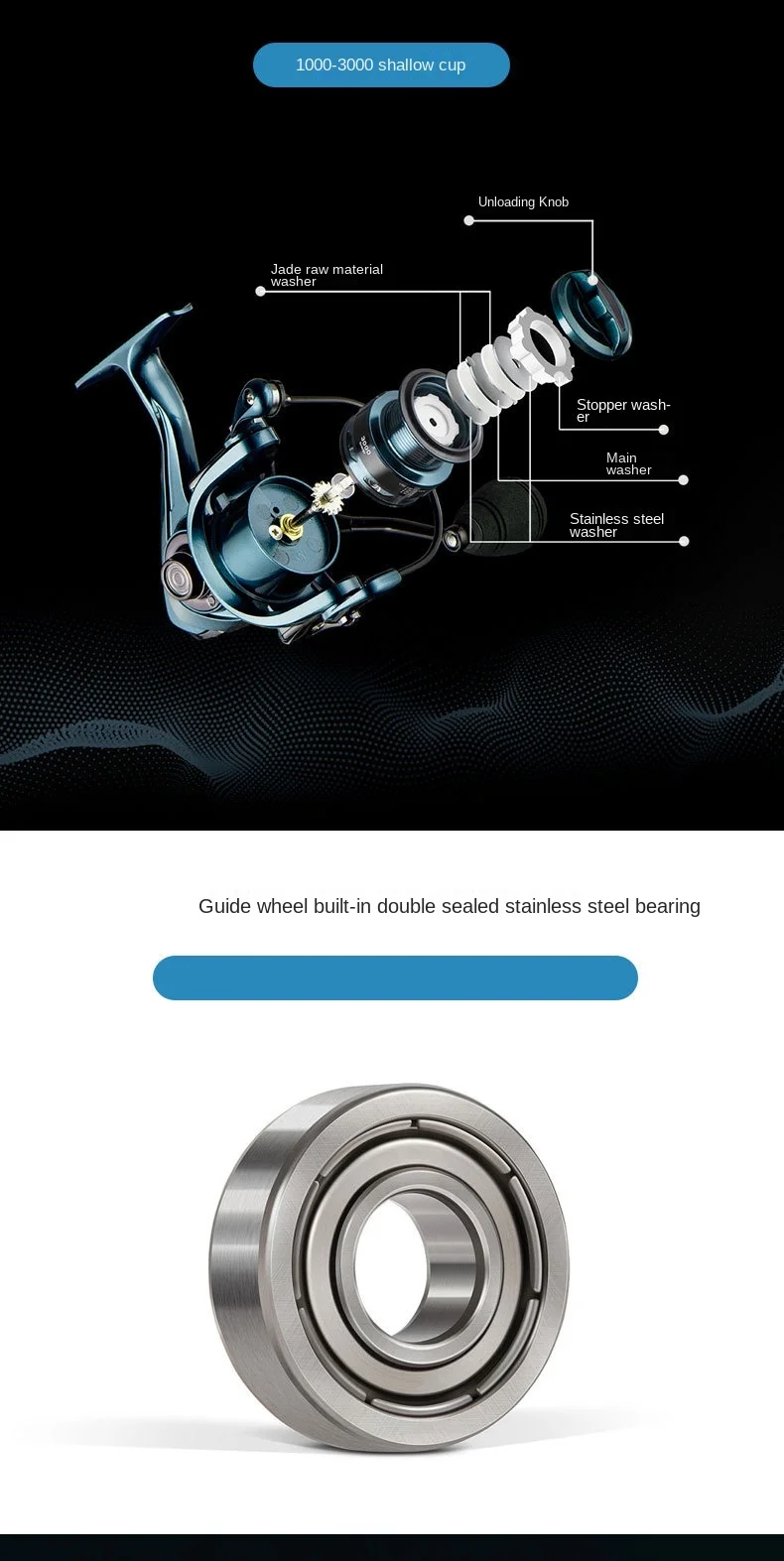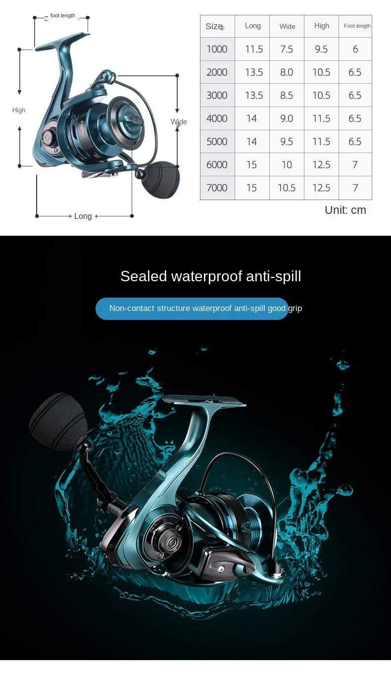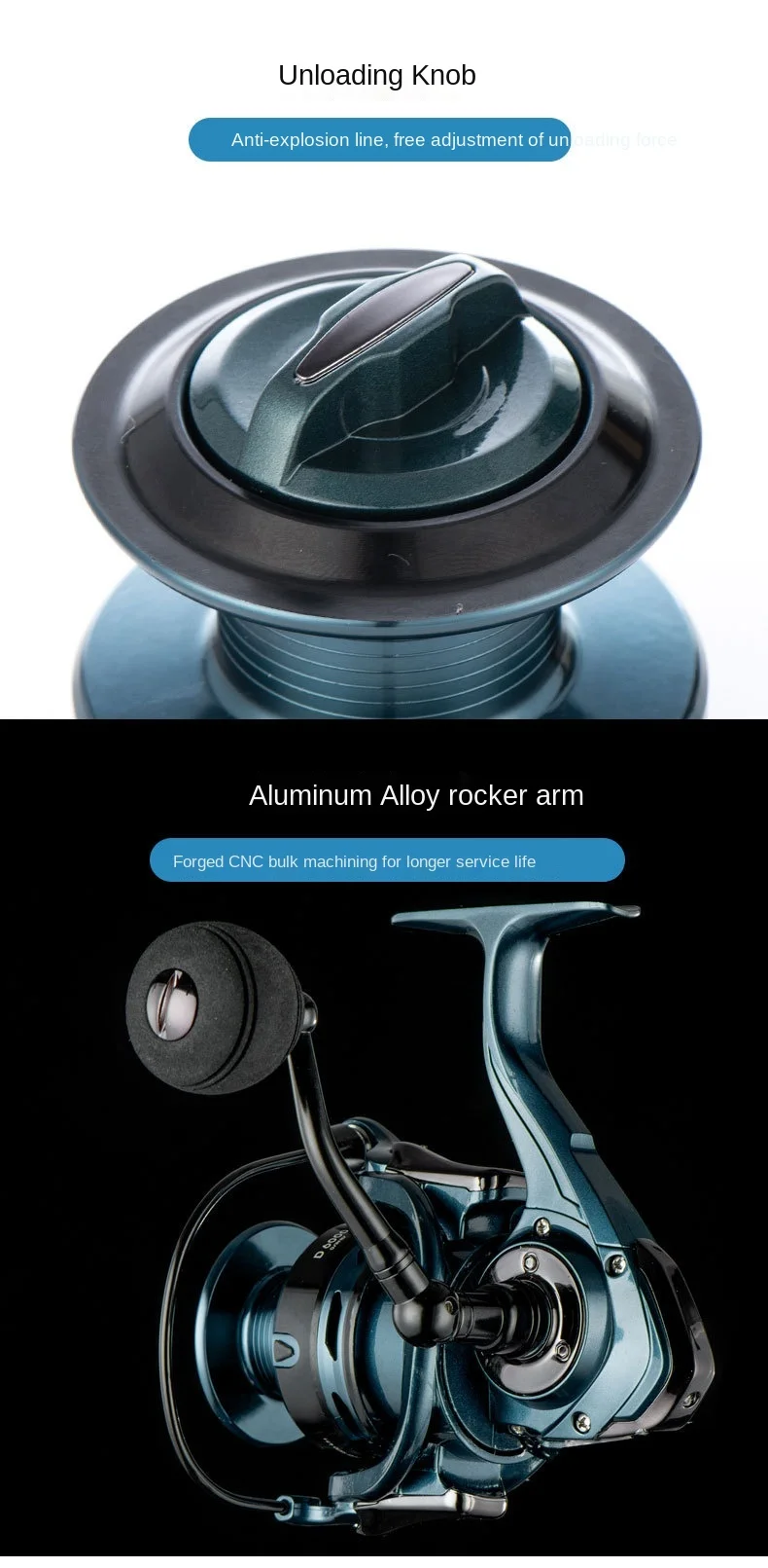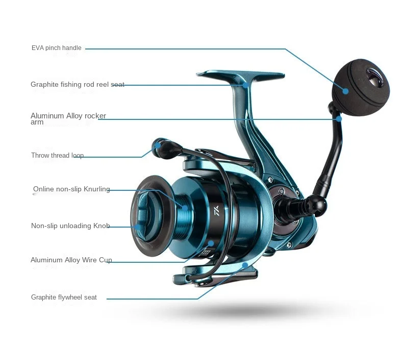 Freno de retroceso sin separación de la serie de frenos delanteros, respaldo del rodamiento unidireccional, freno sin hueco, freno instantáneo, bucle de línea de lanzamiento en forma de gota, rodamiento doble sellado incorporado,. Lo que mejora la manga de cobre que pasa por la línea tradicional retraer y desenrollar, y resolver la tarjeta de lanzamiento y lanzamiento. El carrete de pesca para problemas como líneas está formado por un nuevo molde en una sola pieza, con una taza de alambre de aluminio, un balancín plegable totalmente de aluminio,. Y un mango elástico de EVA. El aspecto rígido es más potente e interior.