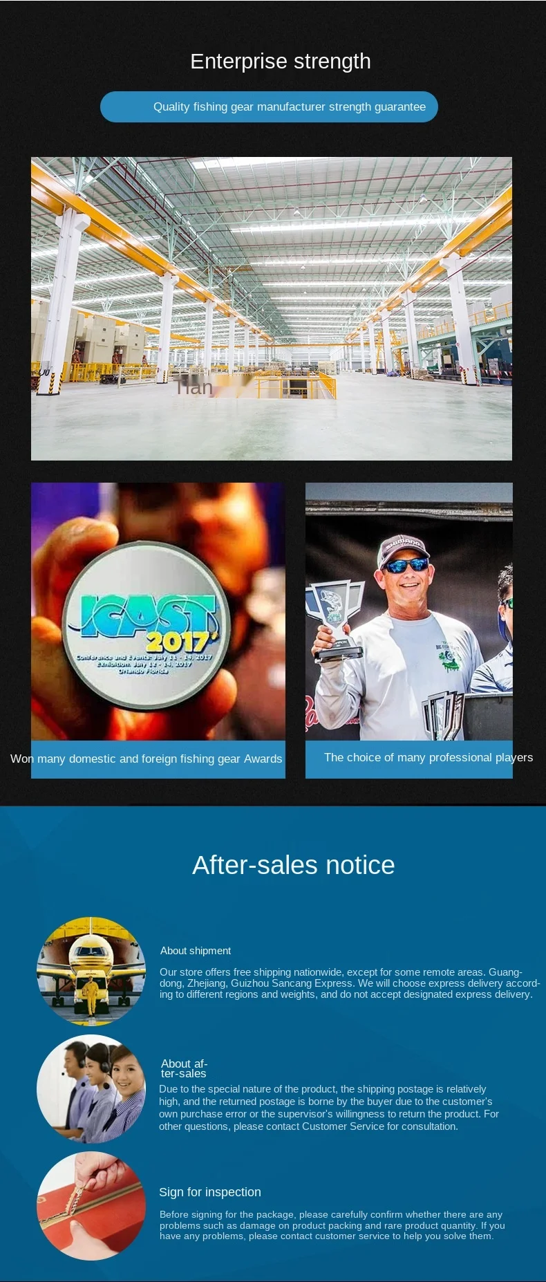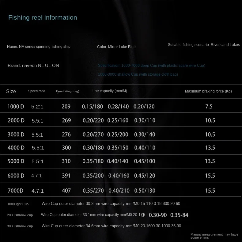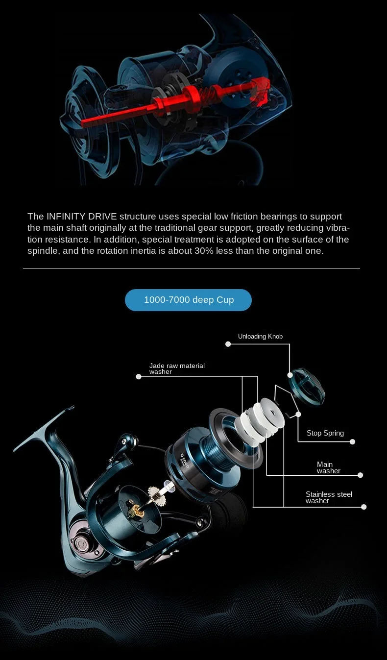 Freno de retroceso sin separación de la serie de frenos delanteros, respaldo del rodamiento unidireccional, freno sin hueco, freno instantáneo, bucle de línea de lanzamiento en forma de gota, rodamiento doble sellado incorporado,. Lo que mejora la manga de cobre que pasa por la línea tradicional retraer y desenrollar, y resolver la tarjeta de lanzamiento y lanzamiento. El carrete de pesca para problemas como líneas está formado por un nuevo molde en una sola pieza, con una taza de alambre de aluminio, un balancín plegable totalmente de aluminio,. Y un mango elástico de EVA. El aspecto rígido es más potente e interior.