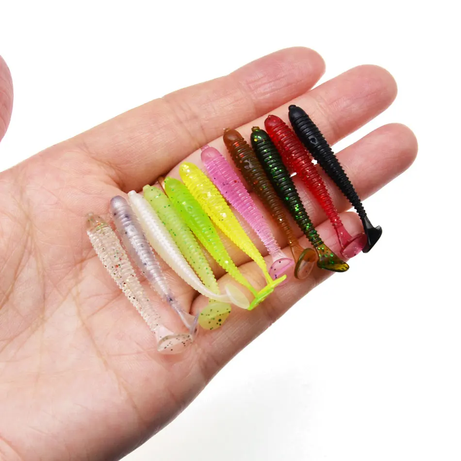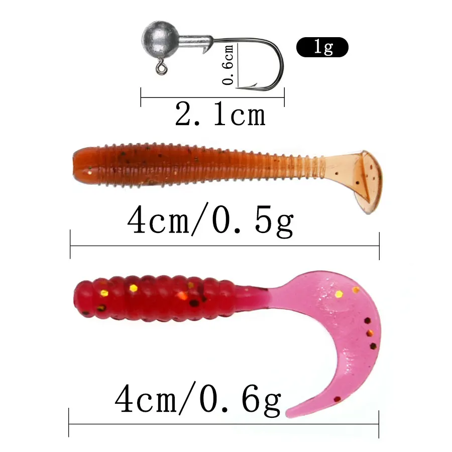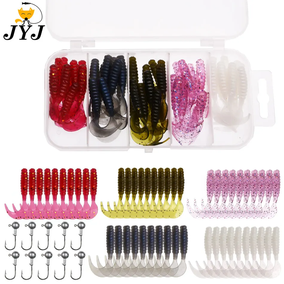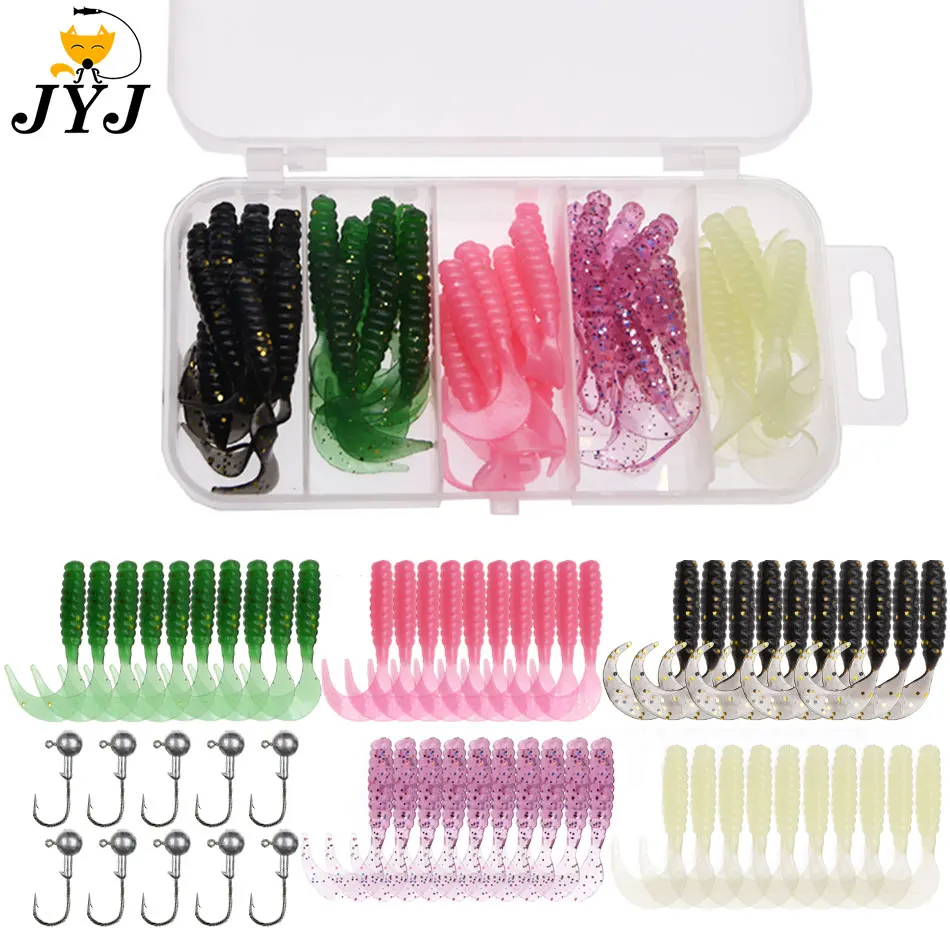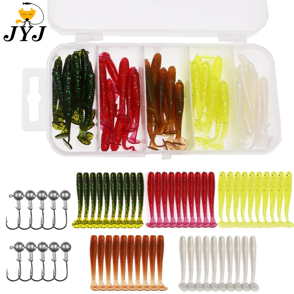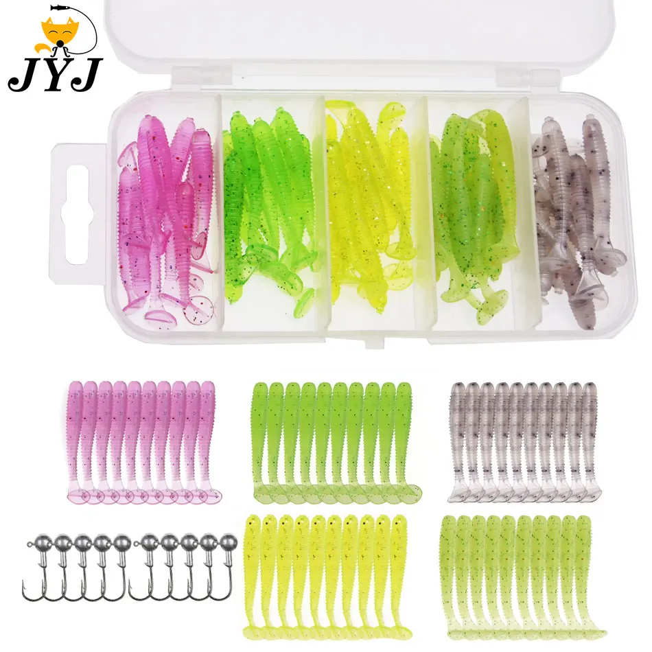 Conjunto de aparejos de pesca JYJ de 50 piezas, cola de paleta suave, señuelo de larva de gusano suave con 10 piezas, gancho de plantilla de 1g, cebo wobbler