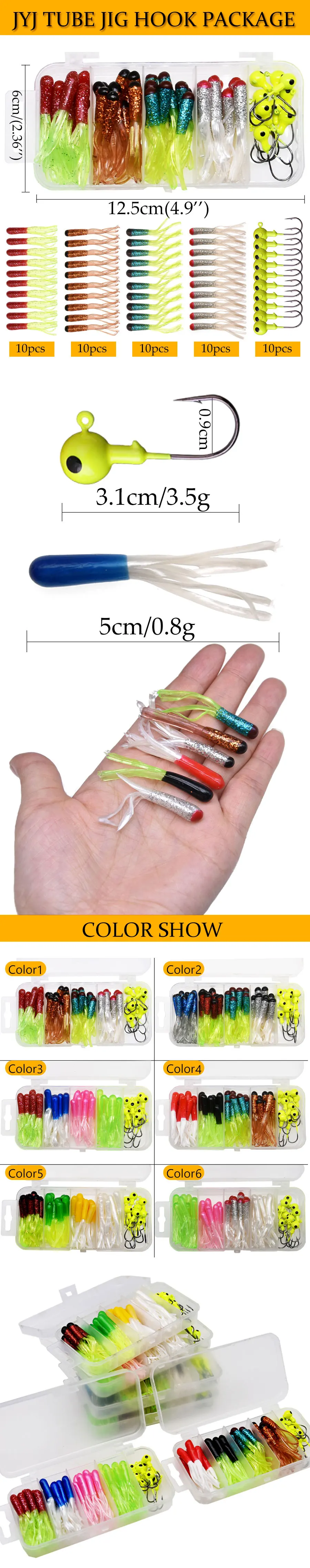 JYJ Box package Juego de pesca 50 cm 5cm gusano de tubo suave con 3,5g anzuelo de cabeza de plantilla de sílice señuelo de pesca falda cebo para lubina y perca