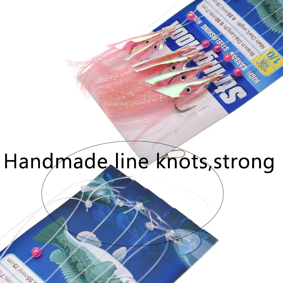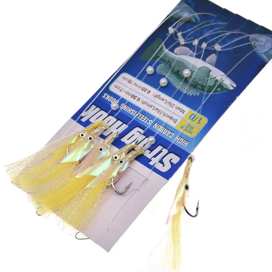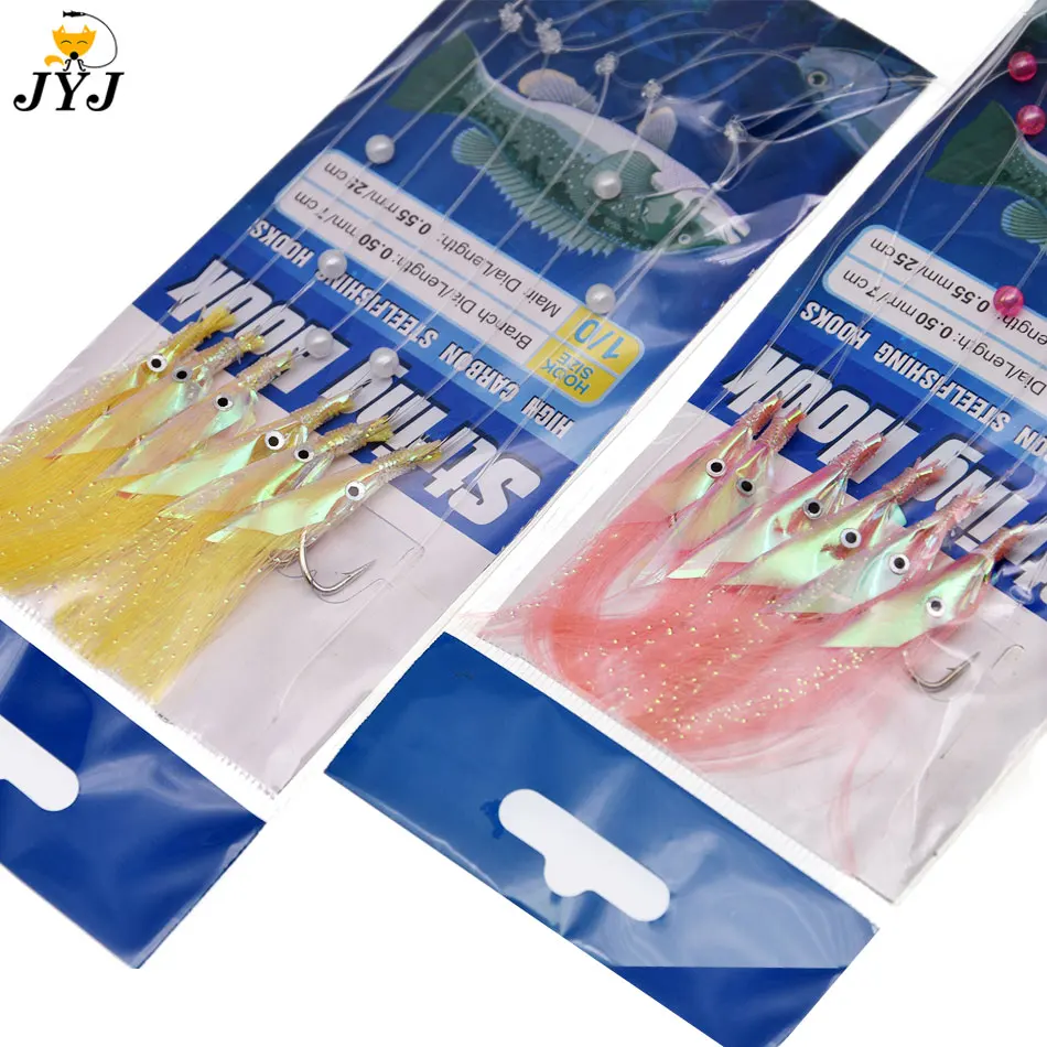 Estos aparejos sabiki todos hechos a mano, 6 brazos con tiras pluma brillante. Dos colores: amarillo y rosa.