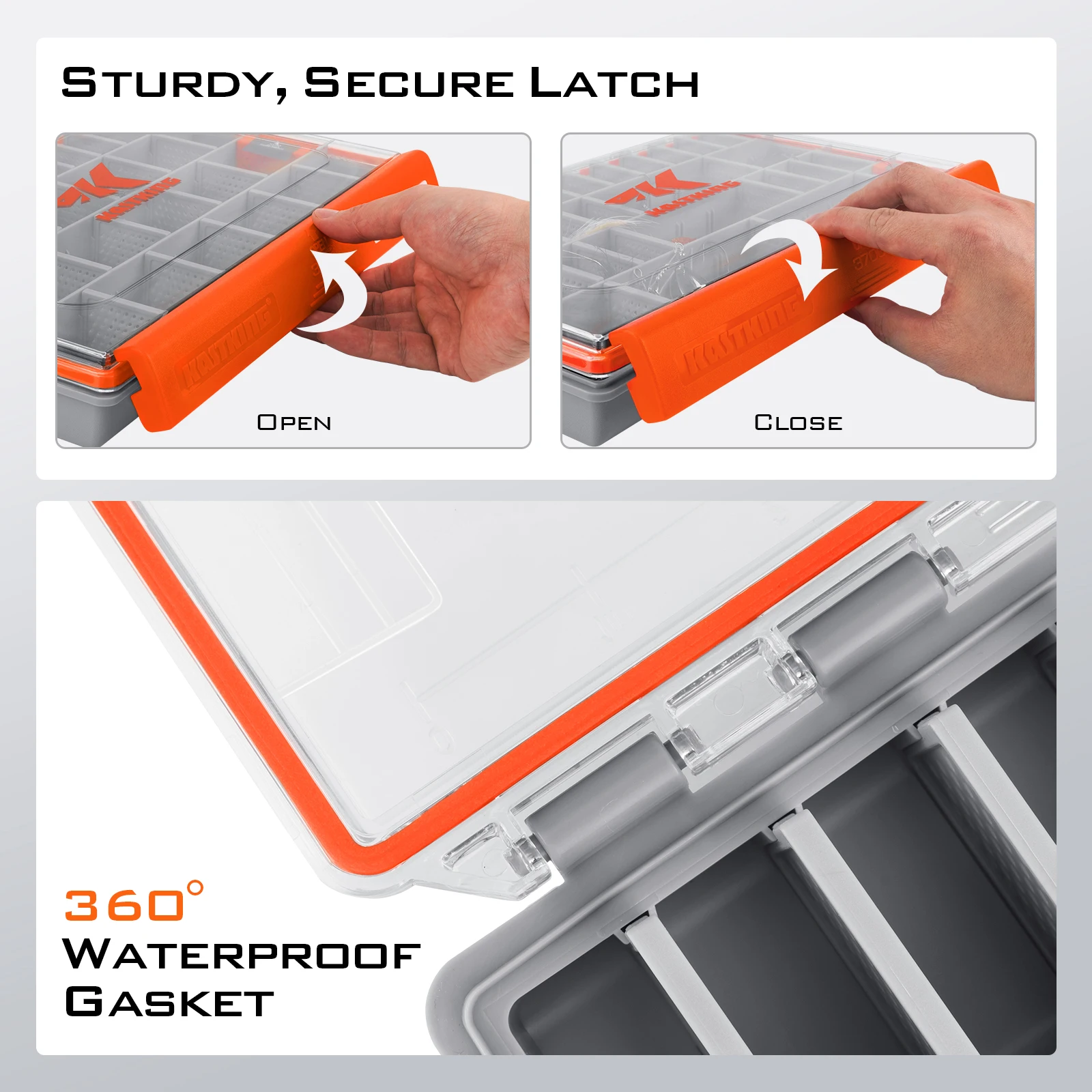 • Diseño impermeable de HyperSeal:La caja de aparejos de pesca impermeable KastKing HyperSeal está diseñada con un sello impermeable avanzado, asegurando que su equipo de pesca permanezca seco en cualquier condición climática.