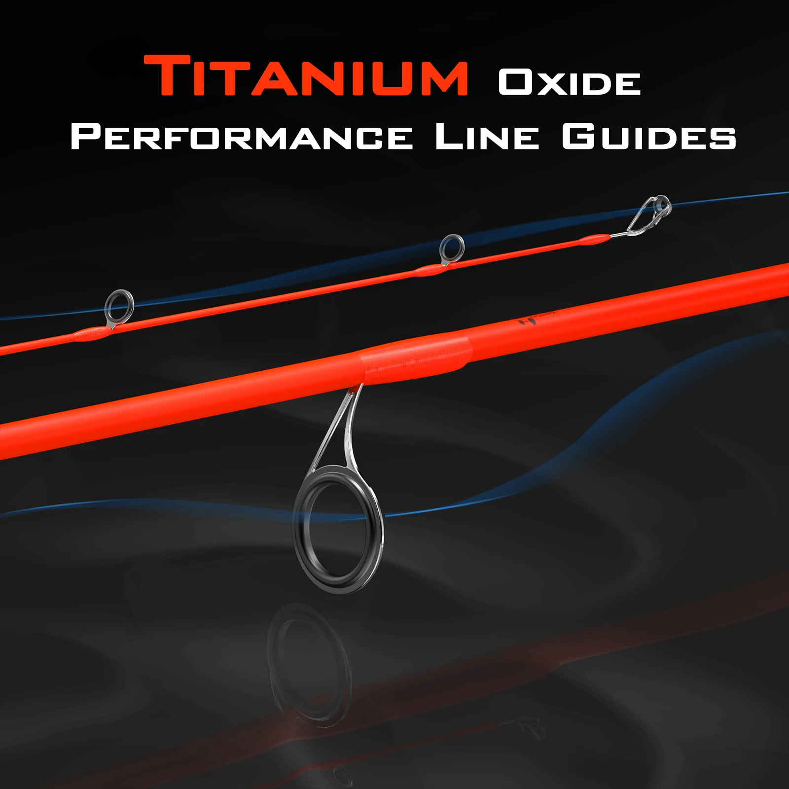 【Titanium Oxide Performance Line Guides】 – Titanium is strong and resilient and when used to create guide rings, provides unmatched durability. This is perfect for today’s super lines (multi-strand braided fishing lines), that are so popular for today’s anglers. LTS, Titanium Oxide guides won’t groove under the pressure of powerful fish and deliver incredible casting distances. All Royal Charge fishing rods include premium stainless-steel guide frames with durable Titanium Oxide rings.