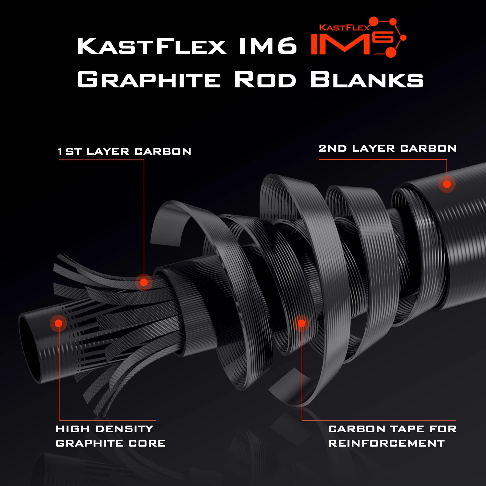 【KastFlex IM6 Graphite Spinning Rods】 –KastFlex IM6 Graphite blanks are highly sensitive, light and incredibly powerful. The high carbon construction enhances the slightest bites and provides the power to penetrate hooks quickly and consistently, so you land more fish. These extremely light spin fishing rods are perfect for most freshwater species and there are even models that will perform in some inshore saltwater applications.