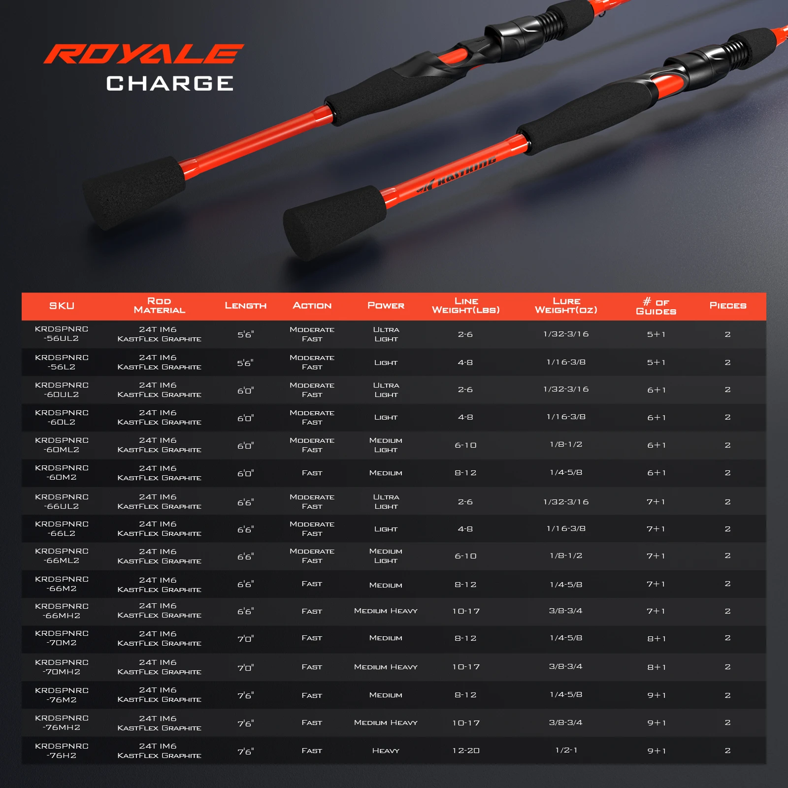 【16 Moderate Fast and Fast Action Spinning Rods – KastKing Royal Charge spinning rods will put a “Charge” into all your favorite fishing species! The Royal Charge fishing rod series is available in 16 models from 5’6” to 7’6”, all with Mod. Fast to Fast actions and power ratings from Ultra-Light to Heavy. “Charge” into fishing performance for freshwater species like trout, bass, walleye, pike, etc.