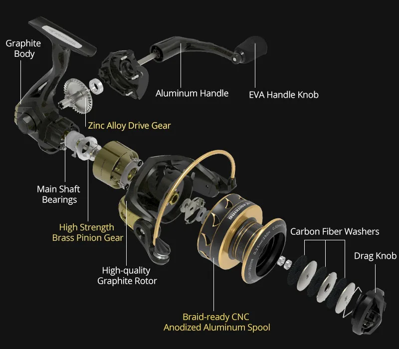 Potente y confiable1. Carrete de aluminio anodizado2. Rotor de grafito de alta densidad3. Cuerpo de grafito de alta densidad