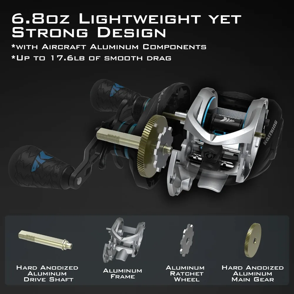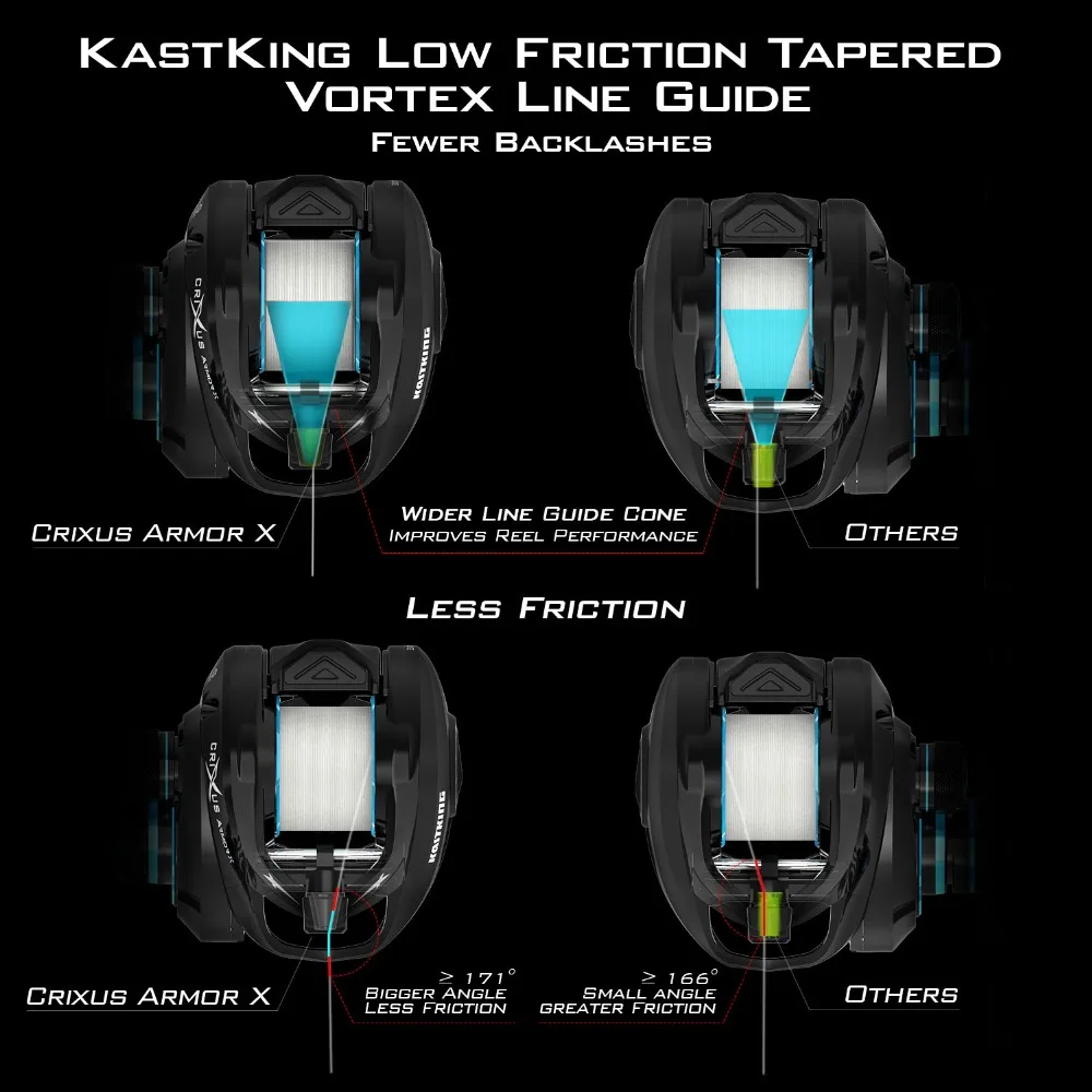 1. Carrete de pesca Baitcasting de perfil bajo con marco de aluminio-¡Pescado fuerte!Los carretes KastKing Crixus ArmorX Baitcasting están diseñados para el rendimiento, para la durabilidad y para ganar. Los baitcasters ArmorX están hechos con un marco de aluminio puro para mayor rigidez y resistencia mientras mantienen el peso bajo.2. Componentes probados Pro Angler-Crixus ArmorX es uno de los carretes de fundición más suaves fabricados hoy en día. KastKing utiliza un engranaje principal de aleación de aluminio finamente mecanizado de 38mm. ArmorX también tiene un piñón de latón cortado con precisión que garantiza una vida útil más larga, velocidades más altas y bajo ruido.3. 9 + 1 BBs inoxidable blindado-Los carretes de baitcasting KastKing Crixus ArmorX gobiernan el agua con 10 (9 + 1) rodamientos de bolas de alto rendimiento Blindados de acero inoxidable más un rodamiento anti-retroceso instantáneo. ArmorX utiliza un sistema de frenado magnético fiable y probado que tiene 8 imanes para muchos niveles de frenado de bobina para eliminar excesos frustrantes.4. Arrastre de disco de carbono suave y potente-Con un potente sistema de arrastre de fibra de carbono de 4 discos gestionado por una gran perilla de arrastre de estrella de aluminio, la potencia es solo una parte de este sistema de arrastre de última generación. Los baitcasters Crixus ArmorX ofrecen un arrastre suave y sin problemas al arrancar.