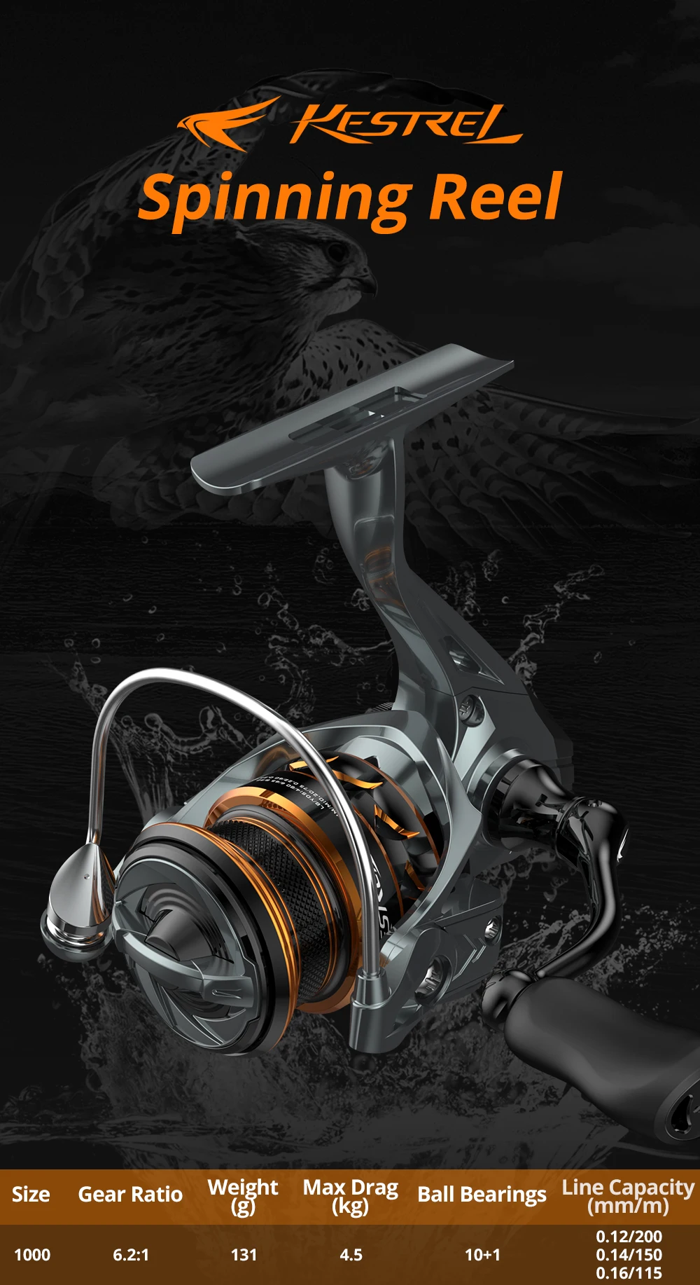 KastKing-carrete de pesca giratorio Kestrel 1000 SFS, cuerpo de carbono 10 + 1, rodamientos de bolas de doble blindaje de acero inoxidable, relación de engranaje 6,2: 1 - imagen 1
