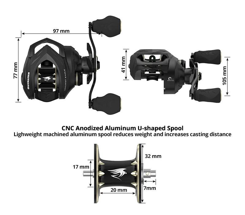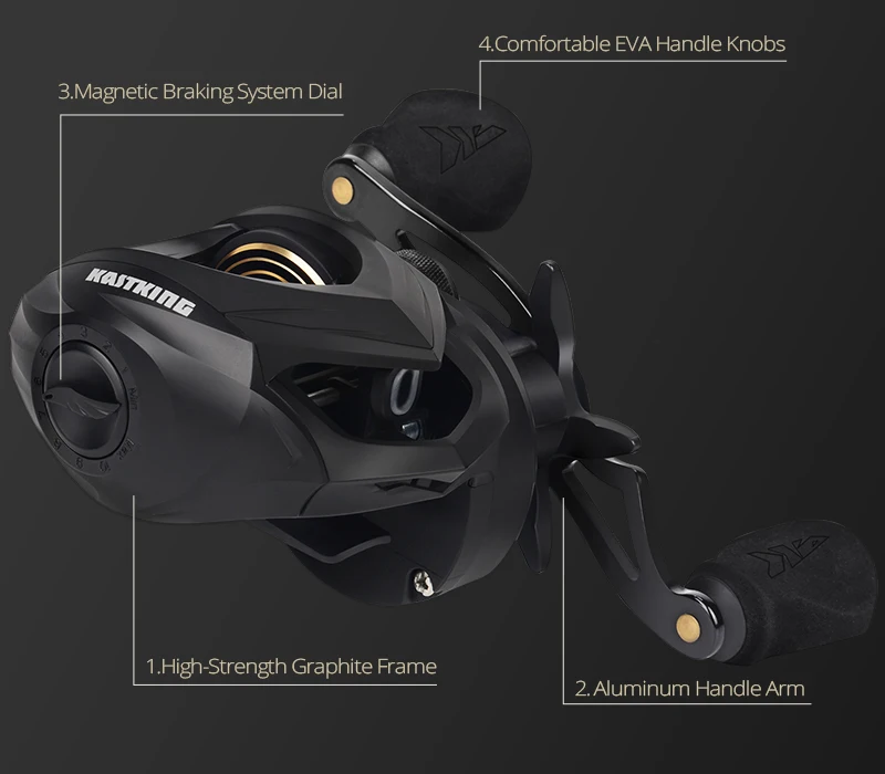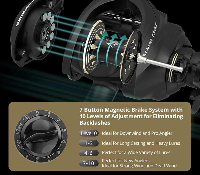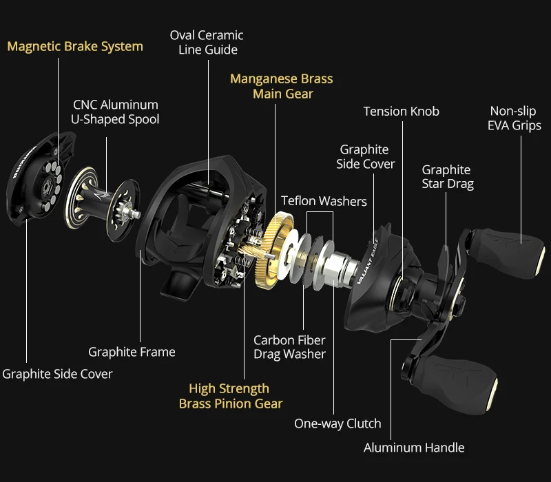 Características del producto:¡NUEVO!EAGLO VALIANTE– ¡Un símbolo de libertad y fuerza americanas, la águila calva se mantiene alta en los corazones de los pescadores estadounidenses!El nuevo y dinámico carrete de Baitcasting de águila KastKing Valiant está hecho para honrar ese símbolo del excelente orgullo americano y ofrece un rendimiento increíble y una calidad confiable a los pescadores desde la costa hasta la costa para la pesca en agua dulce y salada.DISEÑO PERFECTO DE PALMA– Valiant Eagle adopta la filosofía de diseño Perfect de Palm de KastKing.Con una altura del carrete de poco menos de 40 mm, Valiant Eagle es el baitcaster perfecto en tus manos.Además, este increíble carrete de pesca KastKing cuenta con la cubierta lateral Swing-Wing.Puedes abrir fácilmente la cubierta lateral con una mano y no preocuparte por dejarla caer en el agua o dejarla volar.MÁS RÁPIDO Y LIGERO- Los carretes de fundición KastKing Valiant Eagle cubren dos de las relaciones de transmisión más populares y están arrancados con un mango de aluminio de 105 mm que tiene perillas de EVA de agarre seguro.Hay un modelo 6.6:1 con 261 IPT y una relación de transmisión 8,1:1 más rápida que recupera 2,31 IPT de hilo de pescar en su impresionante carrete de aluminio anodizado dorado.El diseño Palm Perfect también ahorra pesos para Valiant Eagle, lo que lo convierte en solo 205 g, lo que es más liviano que la mayoría de los carretes de fundición de grafito disponibles en la actualidad.QUÉ DENTRO– Un carrete de baitcast Valiant Eagle tiene un marco de grafito sólido, rodamientos de bolas con doble blindaje de acero inoxidable 7+1 para un rendimiento excepcional, engranaje principal y piñón de latón de manganeso de precisión con corte Hamai duradero, ejes helicoidales de latón, eje guía y herrajes de acero inoxidable. Arandelas de arrastre de fibra de carbono increíblemente suaves para ayudar a prevenir roturas de líneas luminosas con 17.6 lb de arrastre, guía de línea de cerámica, además de un freno magnético de 7 botones totalmente ajustable.TECNOLOGÍA– El carrete de fundición Valiant Eagle cuenta con la tecnología de piñón con soporte de doble rodamiento, que ofrece un aumento del 35% en la suavidad bajo carga en comparación con los carretes de generación antigua.Esta nueva estructura de diseño aumenta la durabilidad en un 30 sorprendente.Ambos carretes de baitcasting modelo tienen una amplia capacidad de línea.