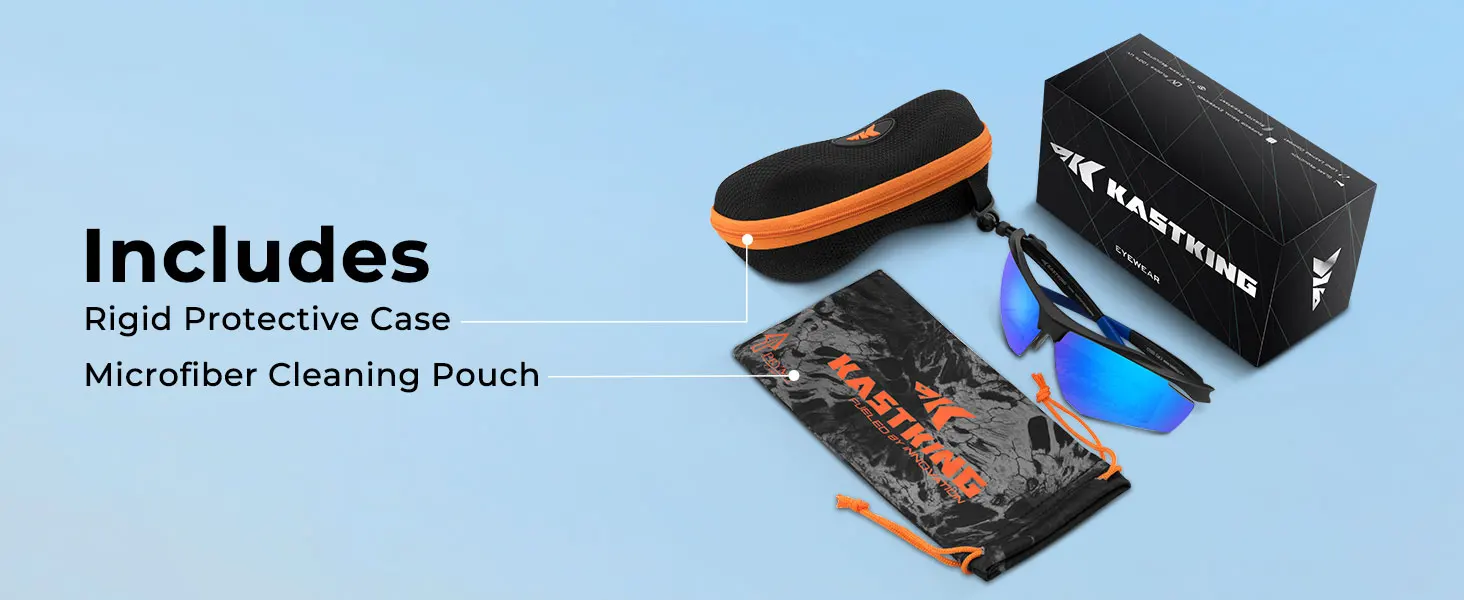 Las gafas de sol KastKing incluyen un estuche rígido moldeado personalizado para almacenamiento y una bolsa de microfibra personalizada Prym1 Camo que se puede usar para limpiar y guardar sus gafas de sol. Para evitar rayones en las lentes y daños en el revestimiento de las lentes, limpie sus lentes con un paño de microfibra limpio o paños sin pelusa y agua tibia y fresca. Nunca los sumerjas en agua salada ni los seques con una toalla de papel.