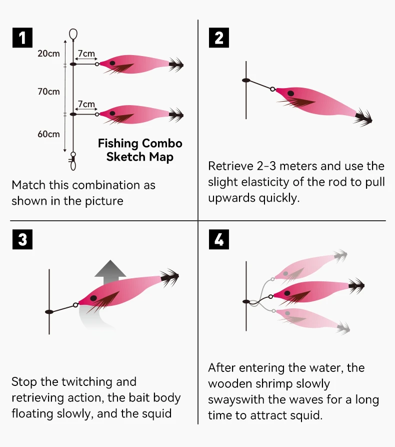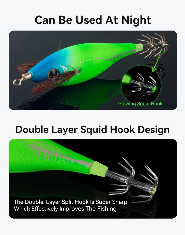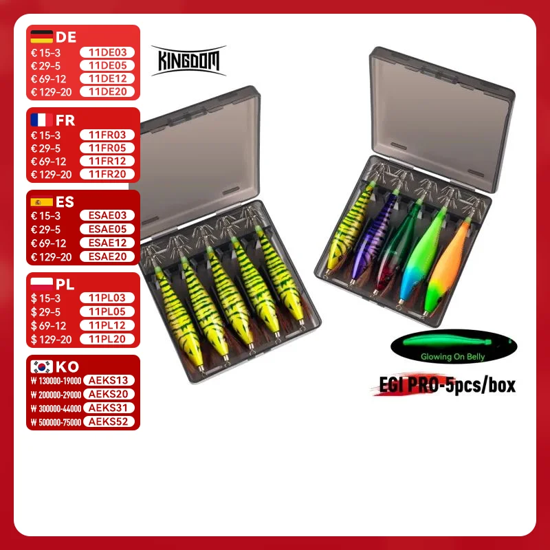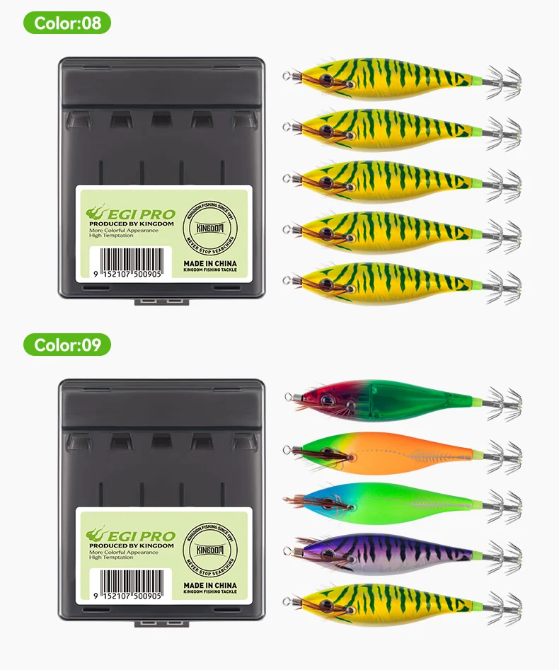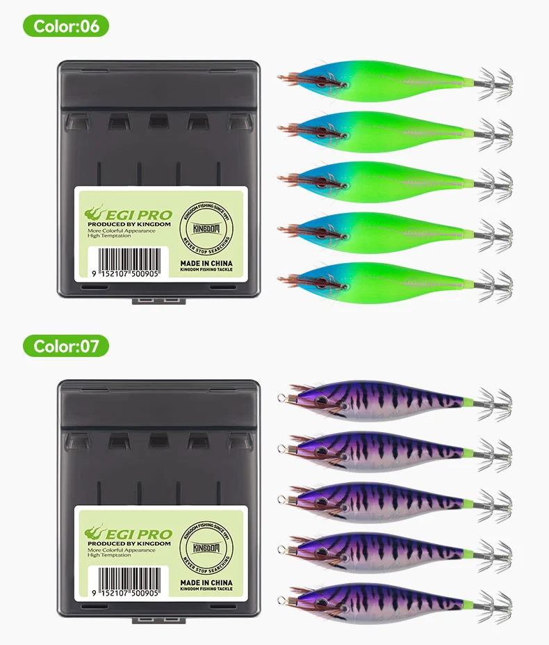 Kingdom, 5 uds., plantilla de calamar luminosa, anzuelo de calamar y camarones de madera, 65/75mm, señuelos de pesca, pulpo, sepia, camarones, cebos EGI de agua salada