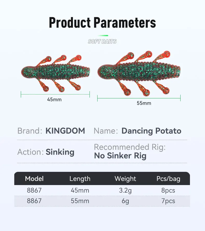 Kingdom 8 Uds Señuelos de Pesca blandos 3,2g 6g 45mm 55mm cebos blandos hundidos de PVC agregar sal olor a pescado señuelos blandos aparejos de pesca