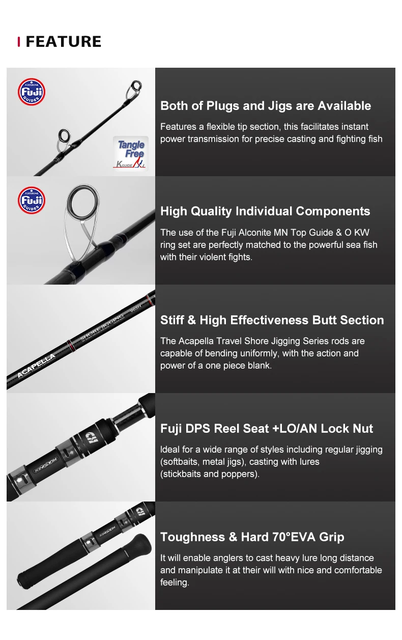 3.[Tecnología negra exclusiva] Estructura de capa en forma de X, diseño liviano, punta sensible + potente sección media a trasera, ¡perfectamente integrada!Carrete Fuji DPS + guías Alconite, ¡completa fácilmente incluso los peces de mar más agresivos!
