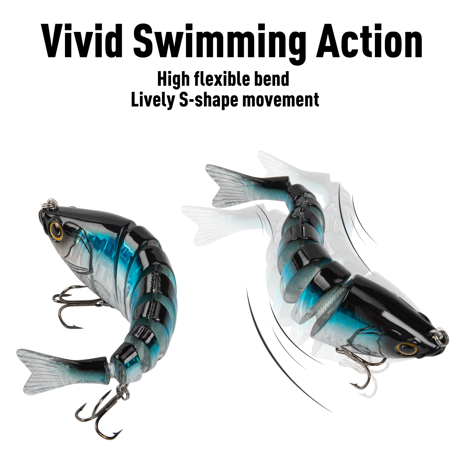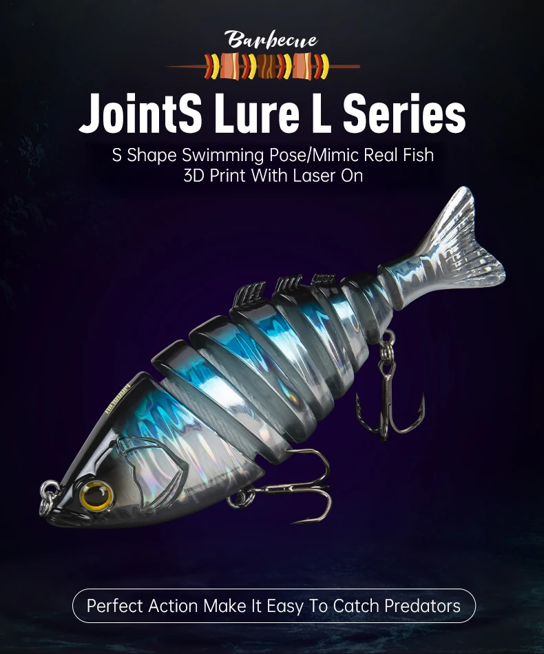 2. Diseño realista: los señuelos para lubina tienen un cuerpo multiarticulado de 6 y 8 segmentos que imita el movimiento real de los peces bajo el agua.Los cebos para peces se hunden lentamente y se mueven con flexibilidad, mientras que la coloración realista atraerá aún más a los peces.