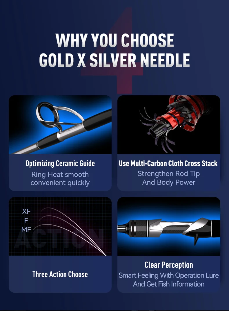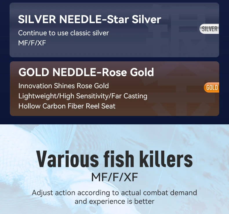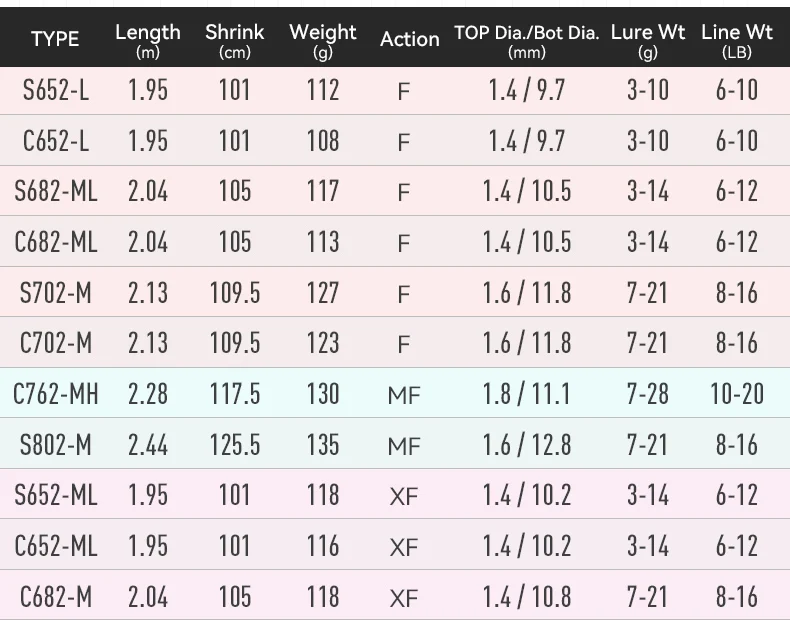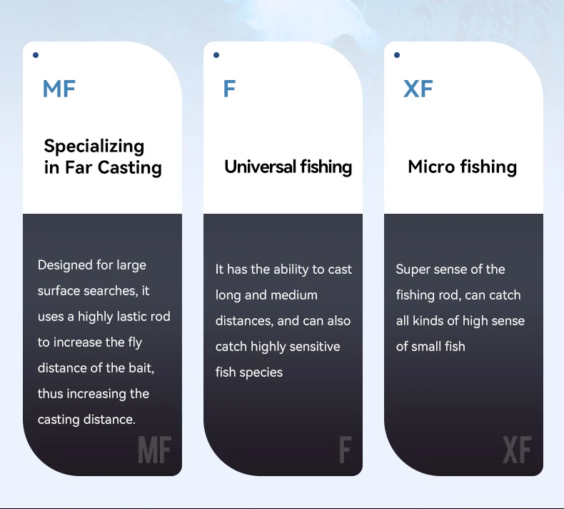 5.Tres viajes para control total: MF para lanzamientos de largo alcance, F para versatilidad y XF para pesca de precisión.Desde arroyos hasta lagos y embalses, desde blanquear hasta gigantes, ¡puedes atraparlos todos con una caña!6.1,95 m-2,44 m, ajuste L/MH, cobertura total, peso de cebo de 3 g a 28 g, ¡compara fácilmente todas las aguas domésticas!