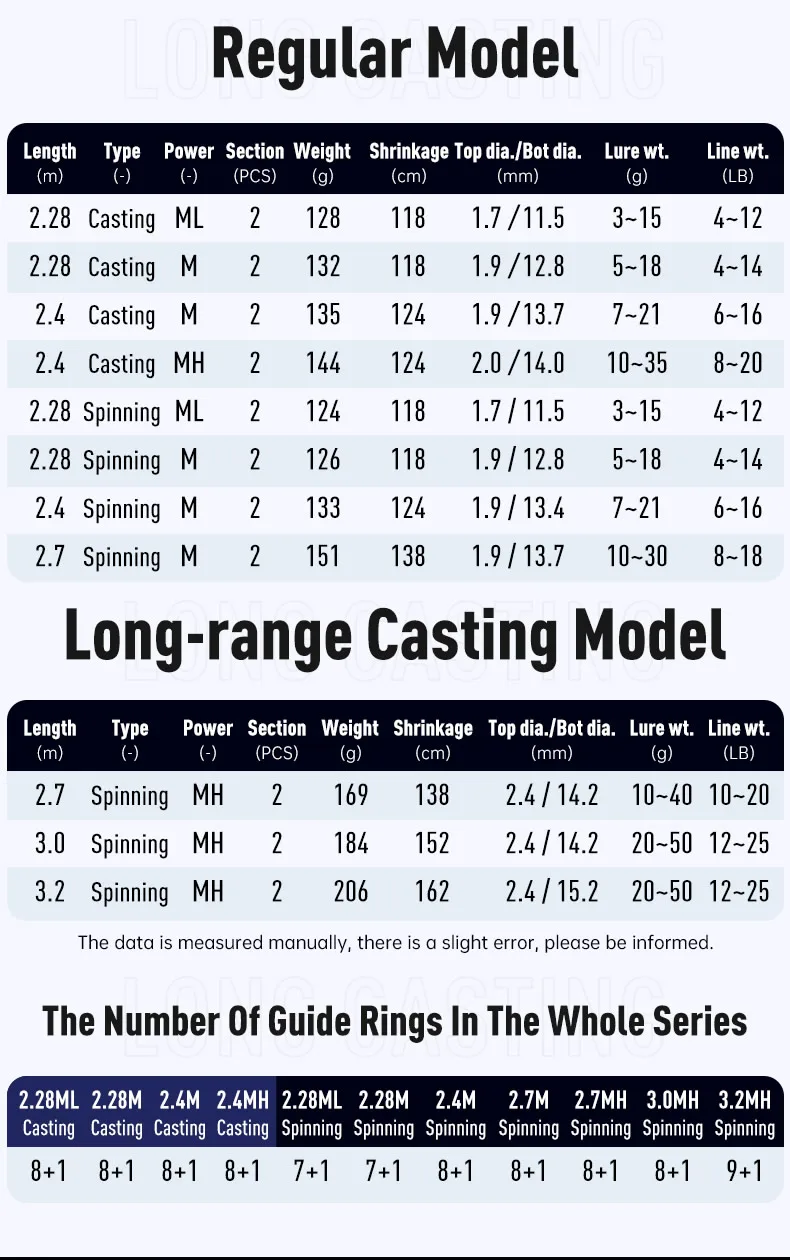 1. La caña de pescar KINGDOM Fortitude Keel IV está dividida en mango recto y mango de pistola. Hay cinco longitudes de 2,28 M, 2,4 m, 2,7 m, 3,0 M y 3,2 m, pero las de 3,0 M y 3,5 m solo tienen asas rectas, que son buenas opciones para todo tipo de pesca.