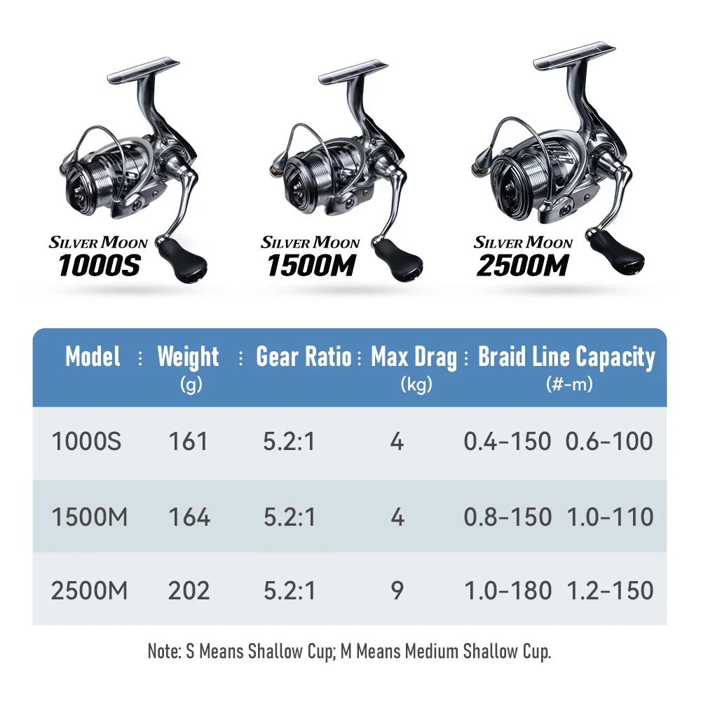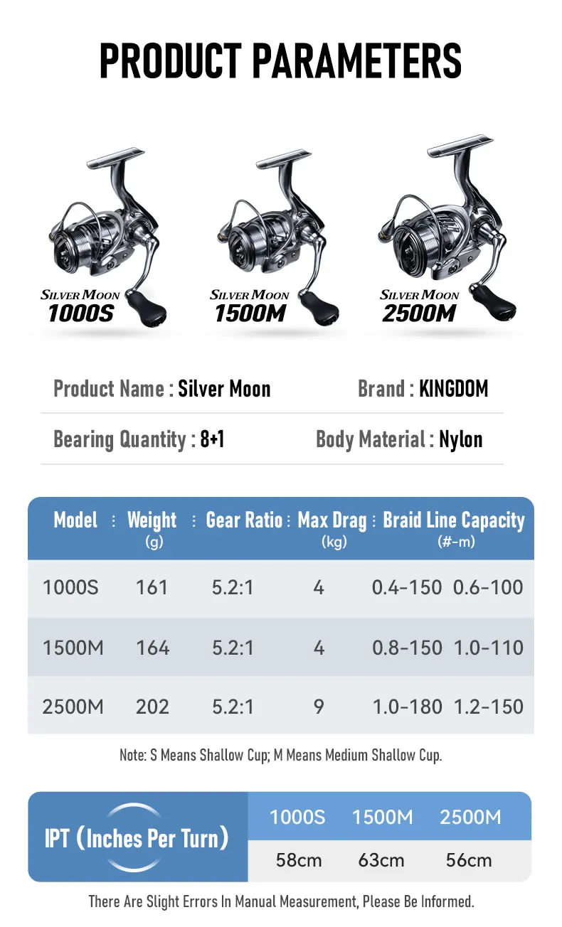 Kingdom-Carretes de pesca giratorios Silver Moon, relación de engranaje 5,2: 1, 9kg, arrastre máximo 8 + 1, rodamientos, cuerpo de nailon de carbono para agua dulce