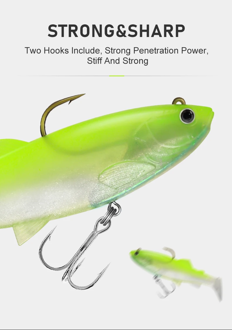 - Normalmente hecho de plástico blando con un peso interno (cabeza de plomo) para ayudar a hundirse.
