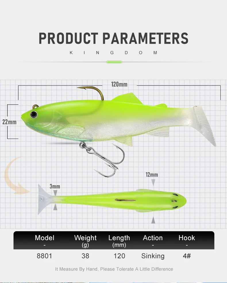Kingdom cebo blando 120mm 38g cabeza de plomo cebos de natación hundimiento señuelo de pesca de mar cola en T cebo Artificial de PVC para pesca de lubina y atún