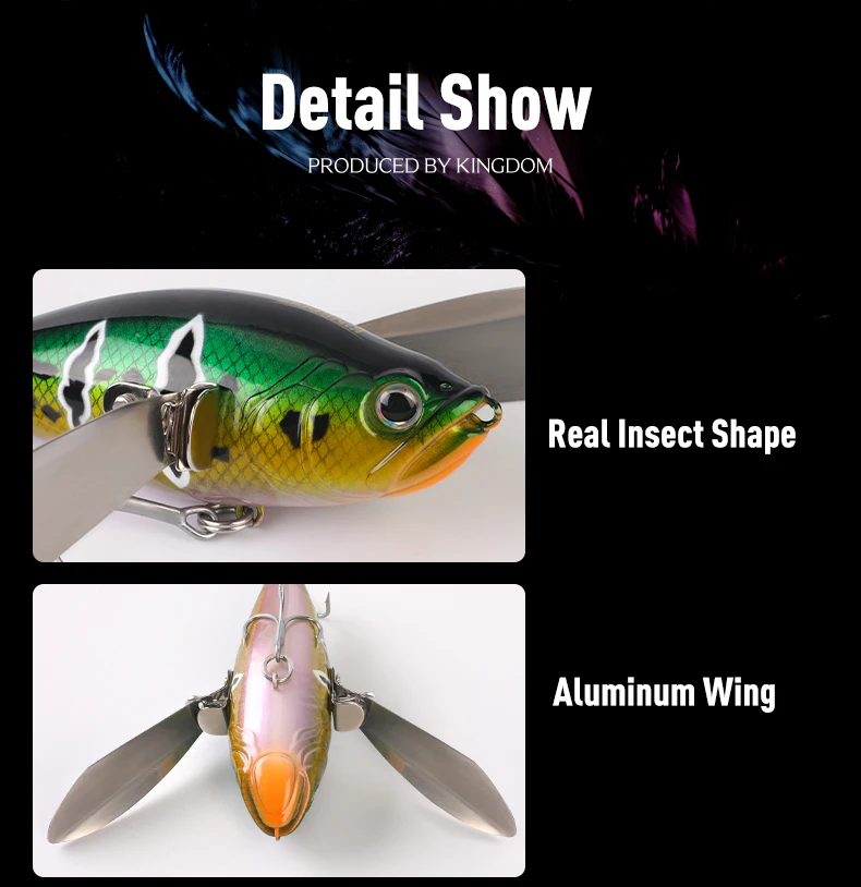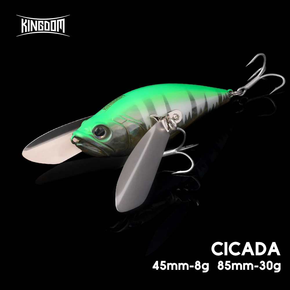Kingdom Cicada Topwater Señuelos 45mm 8g 85mm 30g flotantes de agua salada Bionic insecto Wobblers duros con alas de Metal para pesca de lubina