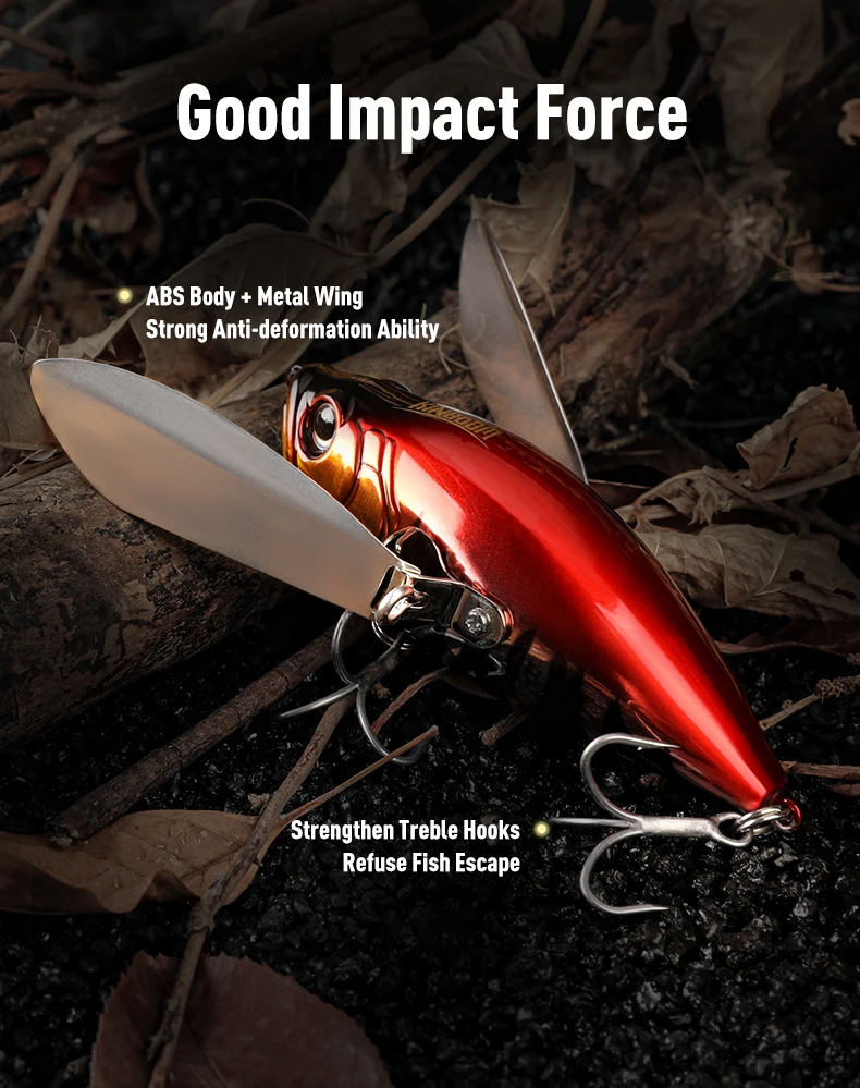 ● Diseño de ala de metal, no fácil de doblar, duradero, que imita la escena de los peces lesionados que fuga al entrar al agua.