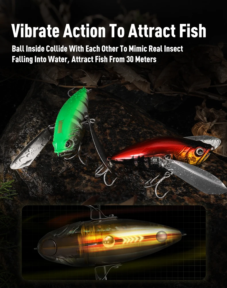 ●Las bolas de acero integradas, el ruido y las salpicaduras de agua generadas al caer al agua, simulan la escena de los insectos que luchan en el agua y pueden atraer peces a una distancia de hasta 30 metros para notarlo.