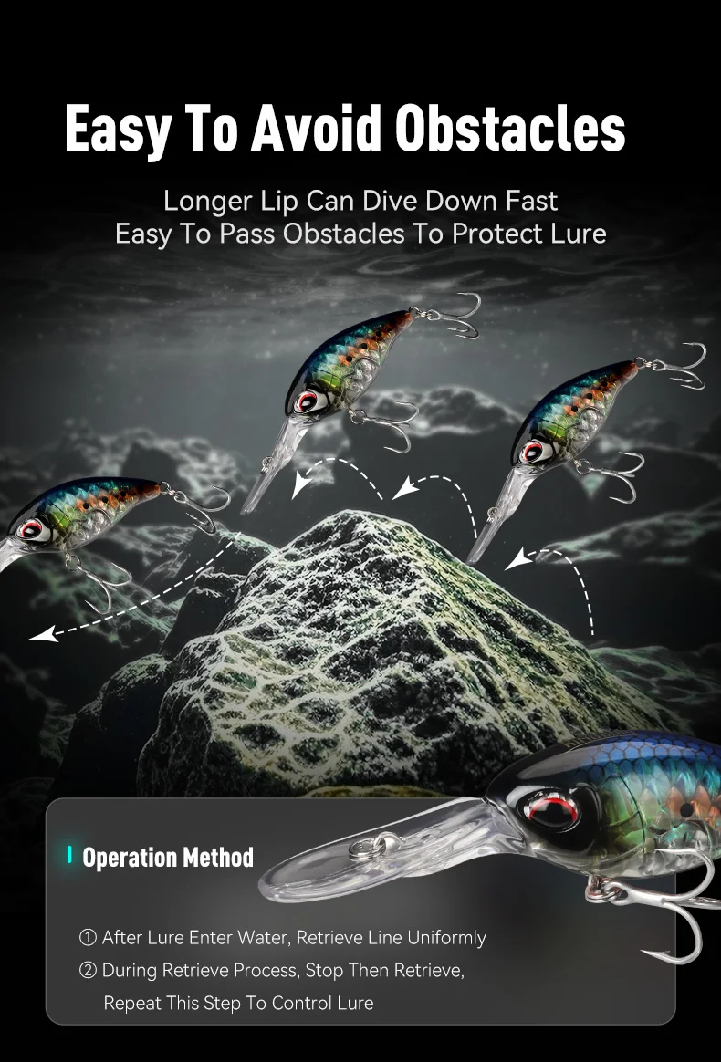 -Acción amplia y oscilante: la forma del pececillo, combinada con un labio de buceo, crea una oscilación apretada y una amplia acción de natación "S" que imita un pez lesionado o fugaz.Esta acción crea vibraciones en el agua que los depredadores pueden detectar con su línea lateral.