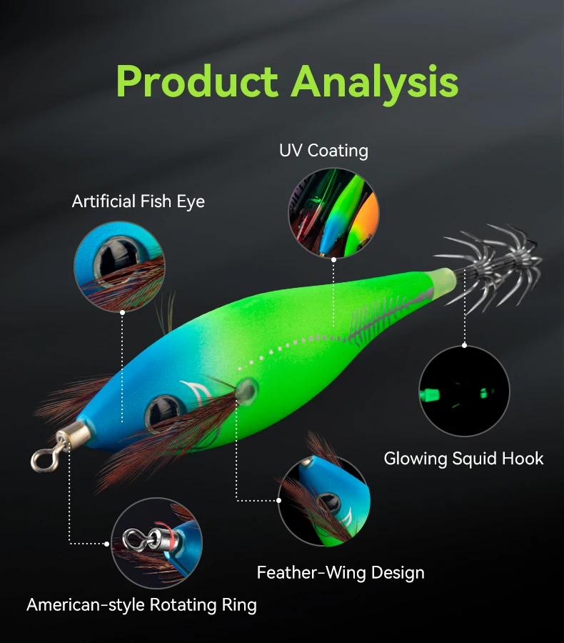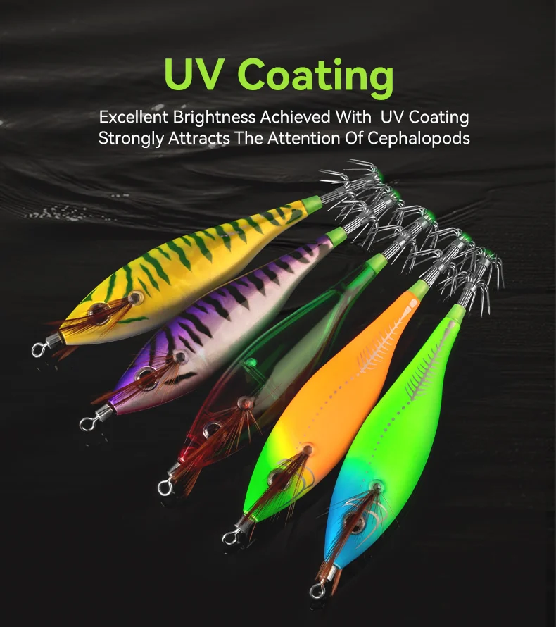 - Luminoso en la parte inferior del gancho, revestimientos UV para atraer calamares en condiciones de poca luz.