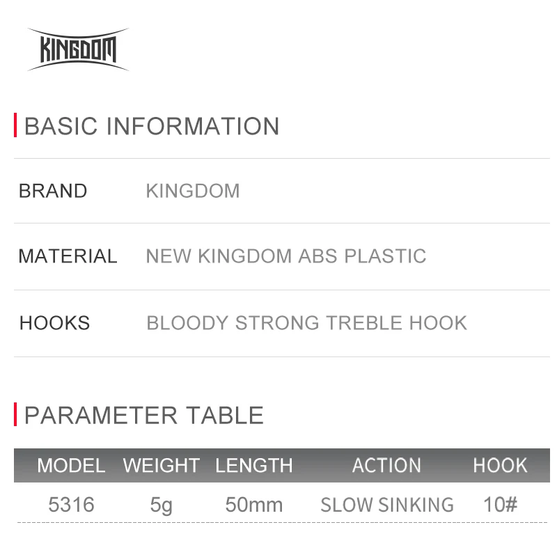 Kingdom Fishing Lures 5g 50mm Slow Sinking Minnow High Quality Artificial Wobbler For Pike Hard Bait Fishing Accessories Tackles