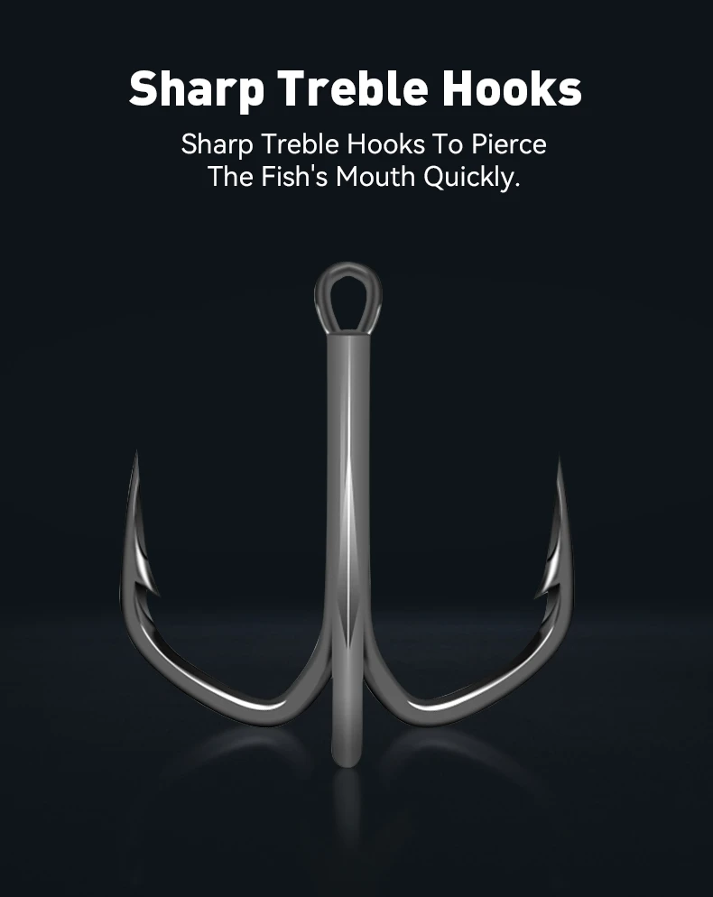 4. Anzuelos triples afilados: anzuelos triples afilados para perforar la boca del pez rápidamente.