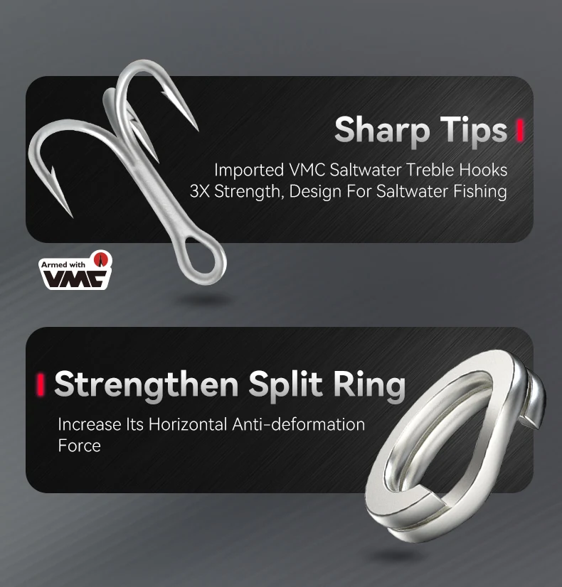 ● Un cable pasante: Utilice un cable de acero de 1,5mm de espesor para atravesar todo el cuerpo del señuelo para asegurarse de que pueda soportar mejor la fuerza de tracción cuando los peces muerdan