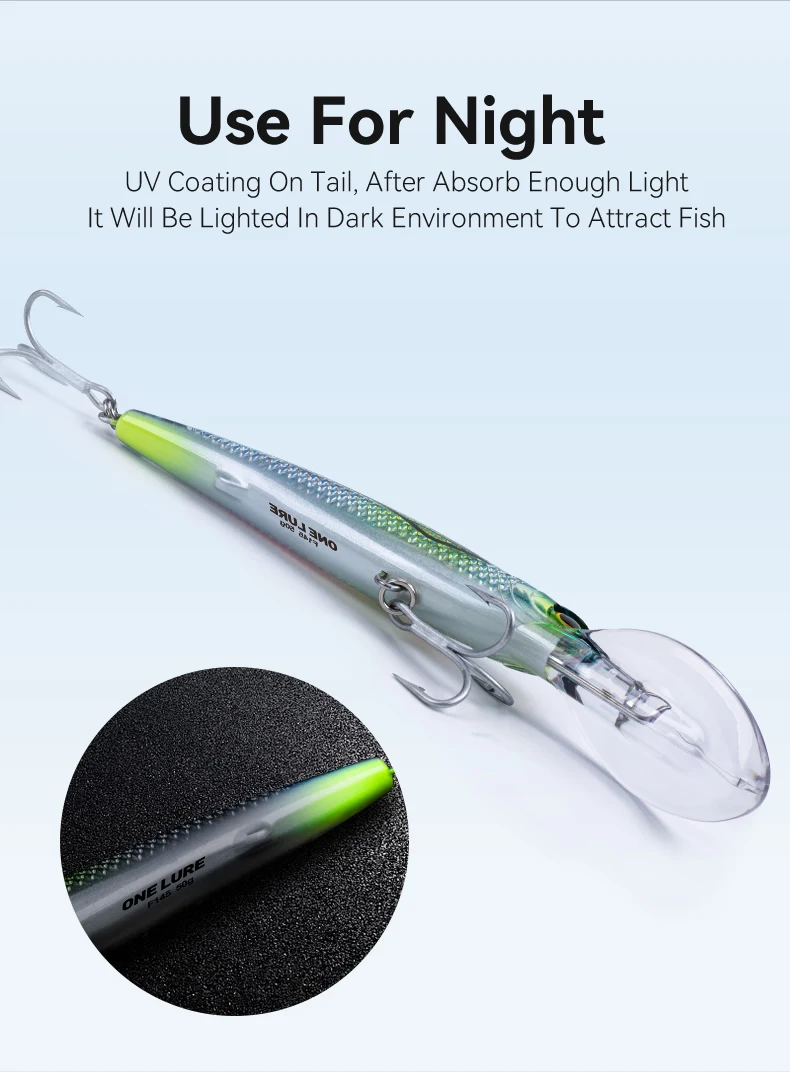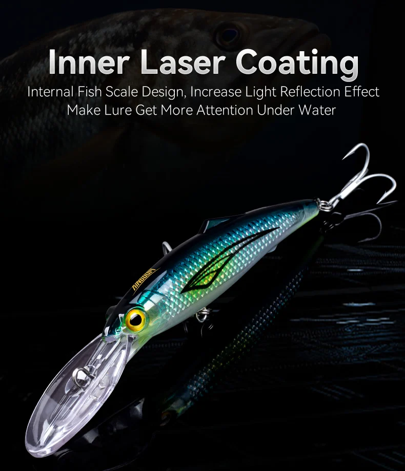 ● Recubrimiento láser interno: diseño interno de escamas de pescado, aumenta el efecto de reflexión de la luz, hace que el señuelo atraiga más atención bajo el agua