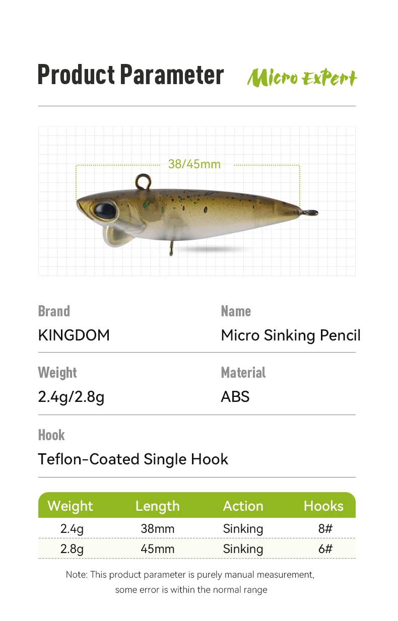 Kingdom Micro Expert-señuelo de pesca con lápiz hundido, 2,4g/38mm, 2,8g/45mm, anzuelo único, cebo duro Artificial, trucha, perca, lubina, Zander