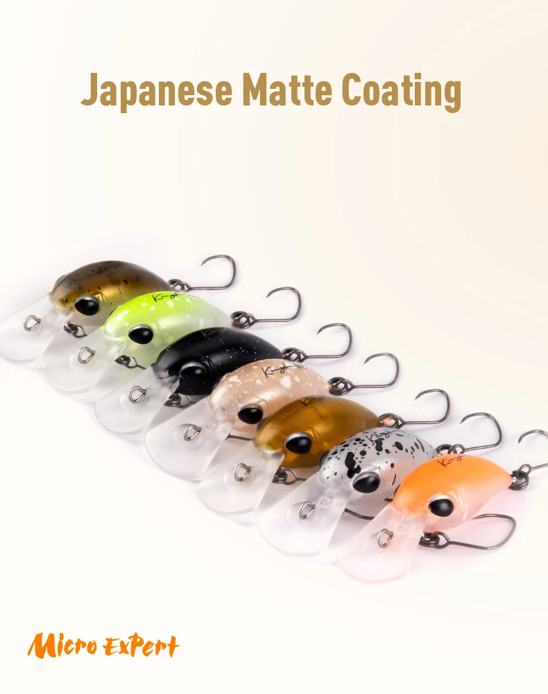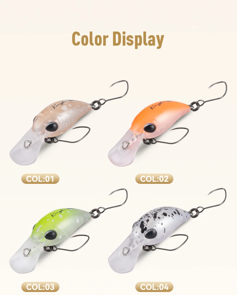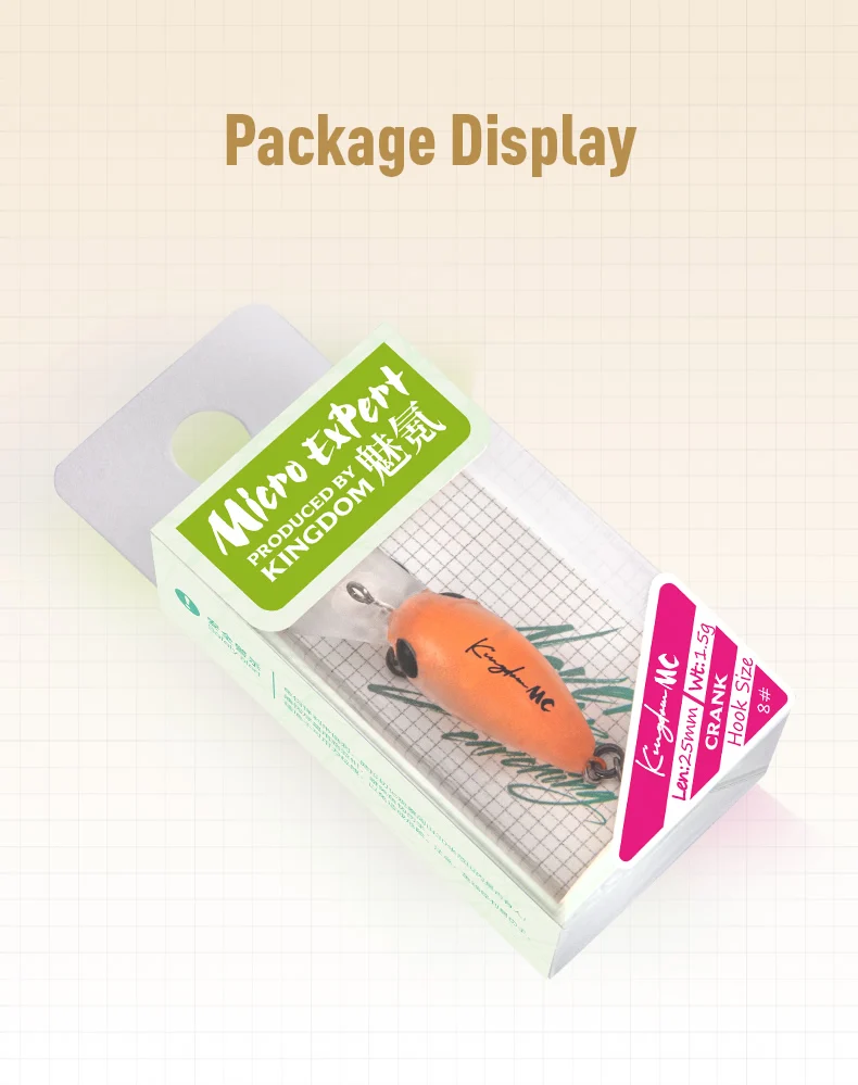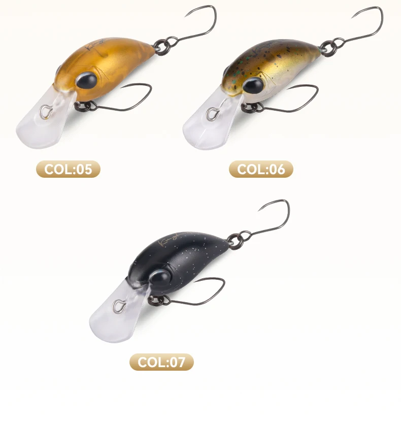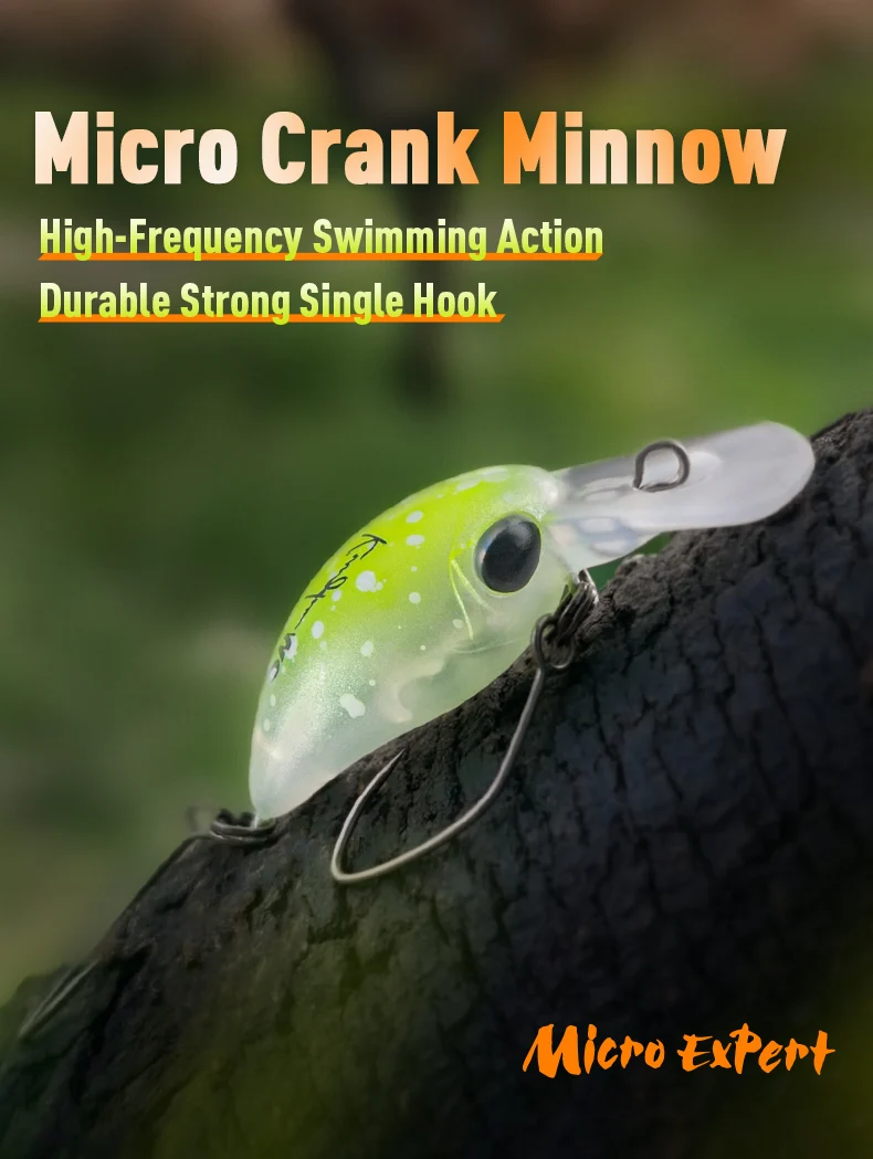 - Más pequeño que los crankbaits estándar, lo que lo hace ideal para la pesca de panfish, tipo de pez y lubina fina.