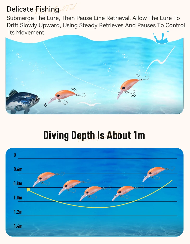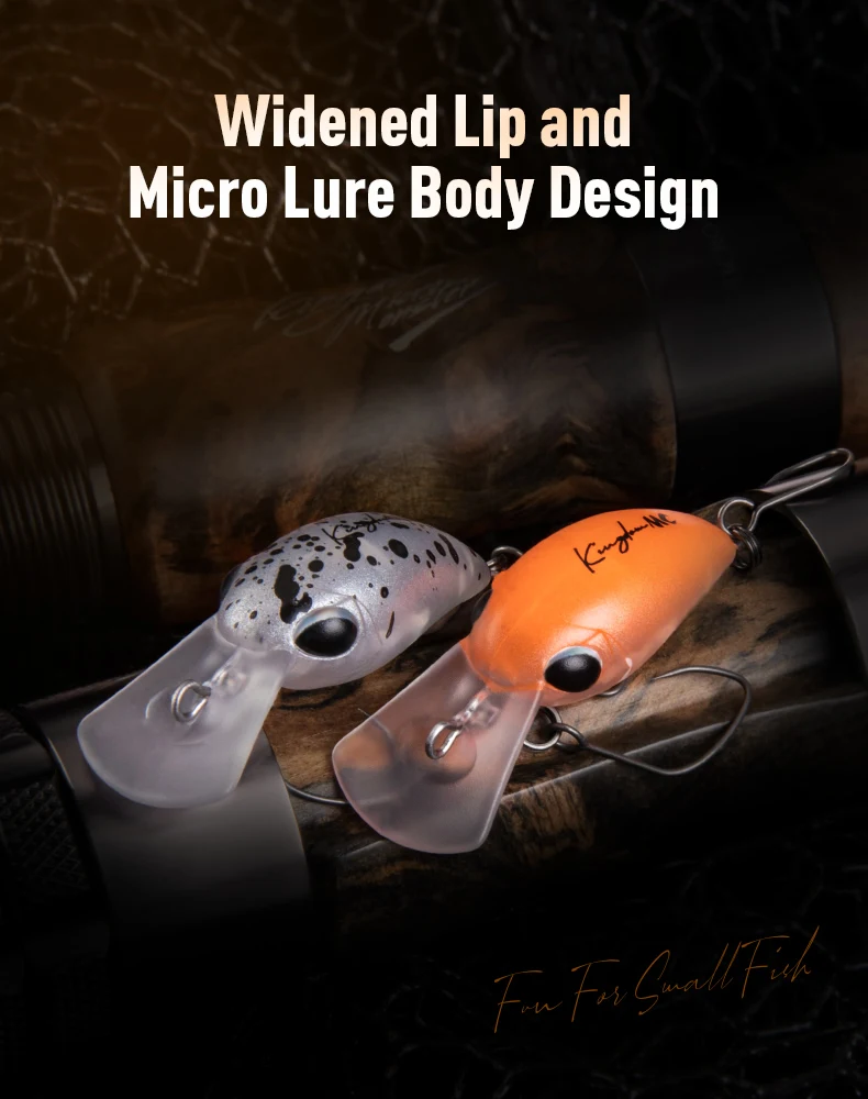 - Al igual que los crankbaits más grandes, su profundidad de inmersión está determinada por el tamaño y el ángulo del labio.