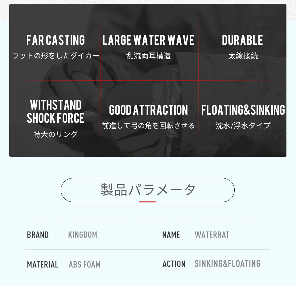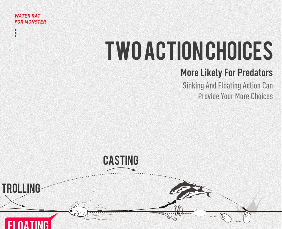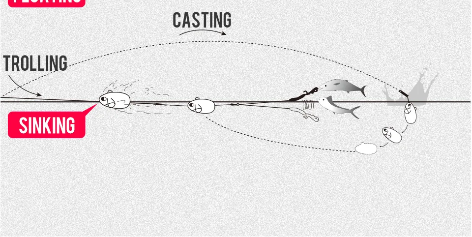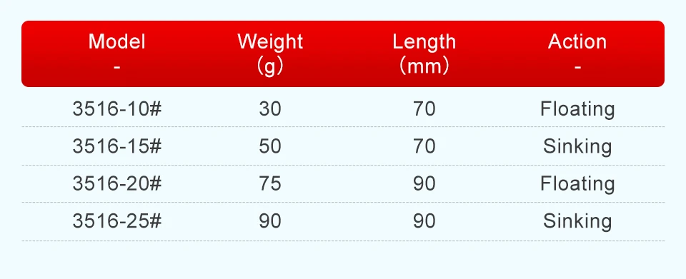 1. Tamaño y acción: 70mm/30g flotante; 70mm/50g hundimiento; 90mm/75g flotante; 90mm/90g hundimiento