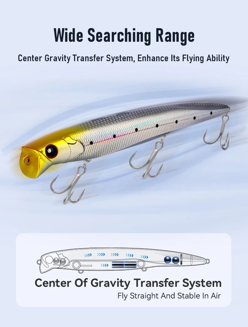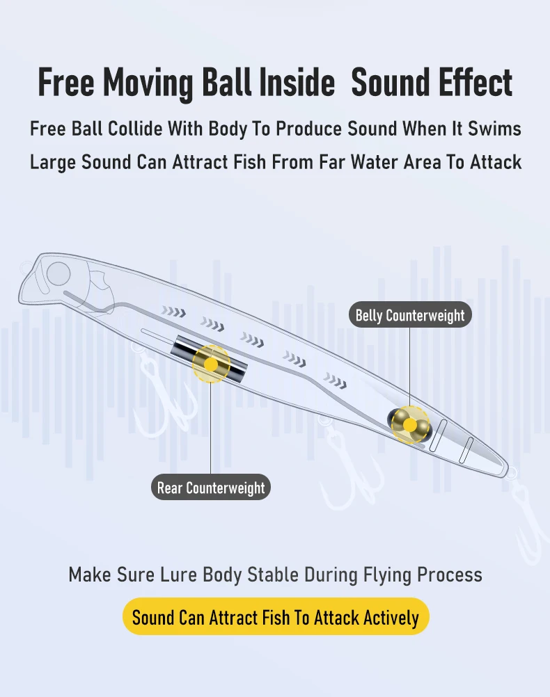 -Al lanzar, las bolas de acero se mueven hacia atrás, el centro de gravedad también se mueven hacia la cola del cebo y aumentan la distancia de lanzamiento.