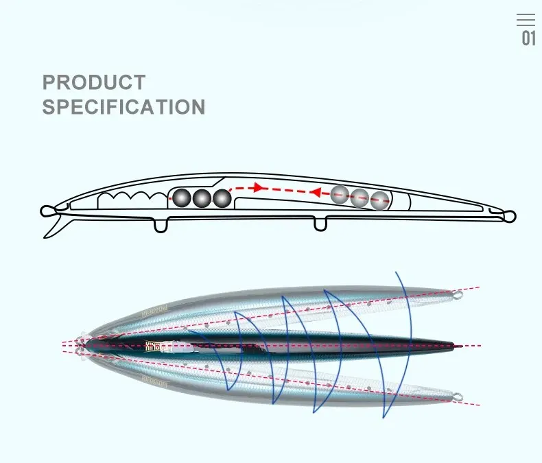 ● Hay bolas de acero dentro del cuerpo del señuelo, el centro de gravedad se mueve hacia atrás después de la fundición.