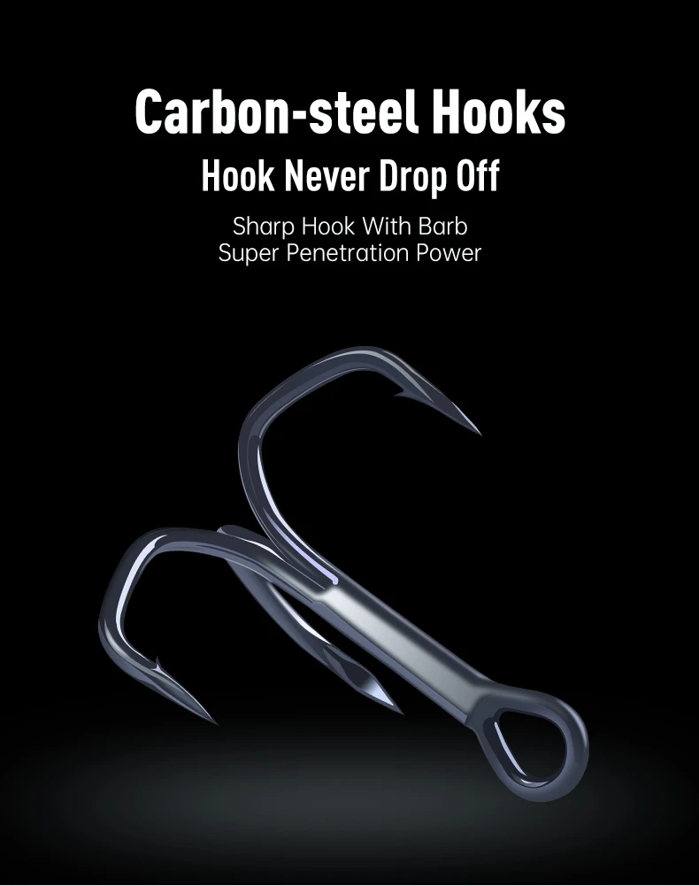3. Ganchos: Equipado con 2 ganchos triples súper afilados a prueba de óxido, alta durabilidad y flexibilidad. Adecuado para agua dulce y salada.